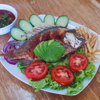 Filete de tilapia al gusto. Con arroz a la mantequilla, papas fritas, ensalada verde y guacamole. Incluye consomé