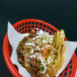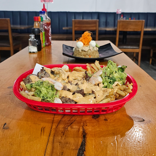 Papas fritas gratinadas con camarón, carne de res, aderezo de chipotle y con guacamole