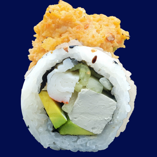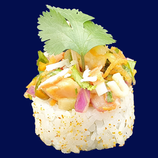 Bola de arroz blanco cubierta de tampico, queso crema, aguacate y zanahoria rallada, bañada con salsa teriyaki.