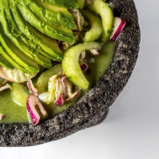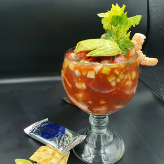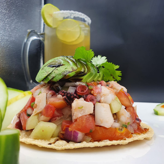 Proteína a elegir, mexicana, pepino, aguacate, clamato, salsa inglesa y maggi. Incluye tostadas, saladitas
