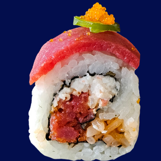 Atún spicy y queso crema, forrado con atún fresco, masago y aguacate, coronado con jalapeño y aceite picante.