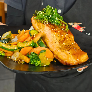 Jugoso filete de salmón a la plancha, bañado con salsa teriyaki de la casa, acompañado de verduras al vapor y arroz blanco. C