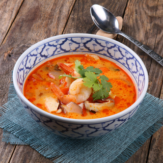 Caldo de mariscos con trozos de la proteína a elegir, apio, zanahoria, garbanzo, cilantro y cebolla