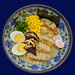 Ramen con caldo de puerco intenso, acompañado de gyozas de carne fritas, shitake, elote amarillo, alga nori, cebollín fresco,