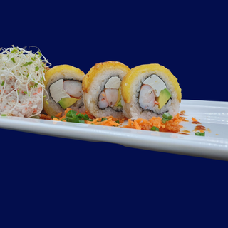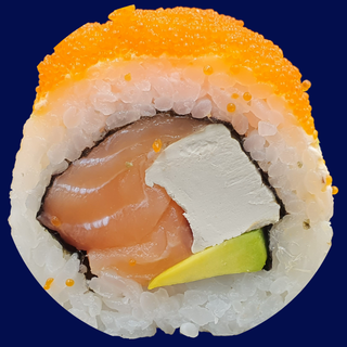 Rollo relleno de queso crema, aguacate, salmón fresco. Cubierto con masago, empanizado sin masago