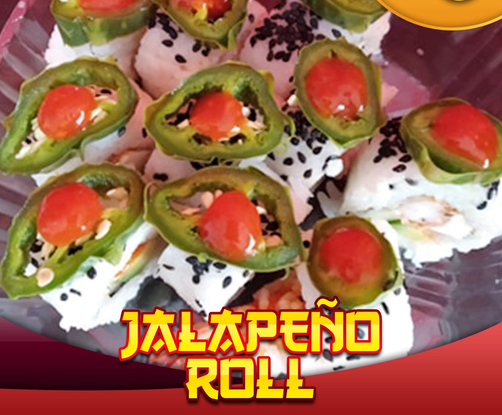 Sushi con ajonjoli negro y una rodaja de chile jalapeño, relleno de pepino, aguacate, philadelphia y la proteína de tu preferencia, acompañado de salsa de soya preparada