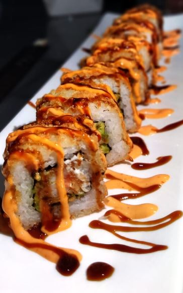 Queso crema, aguacate, camarones empanizados mayonesa picante,y salsa teriyaki