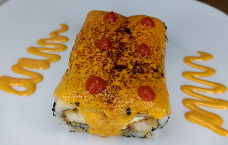 Por dentro queso crema, aguacate, camarón empanizado por fuera queso gouda gratinado y salseado con nuestros aderezos mayonesa picante y salsa teriyaki la mezcla perfecta