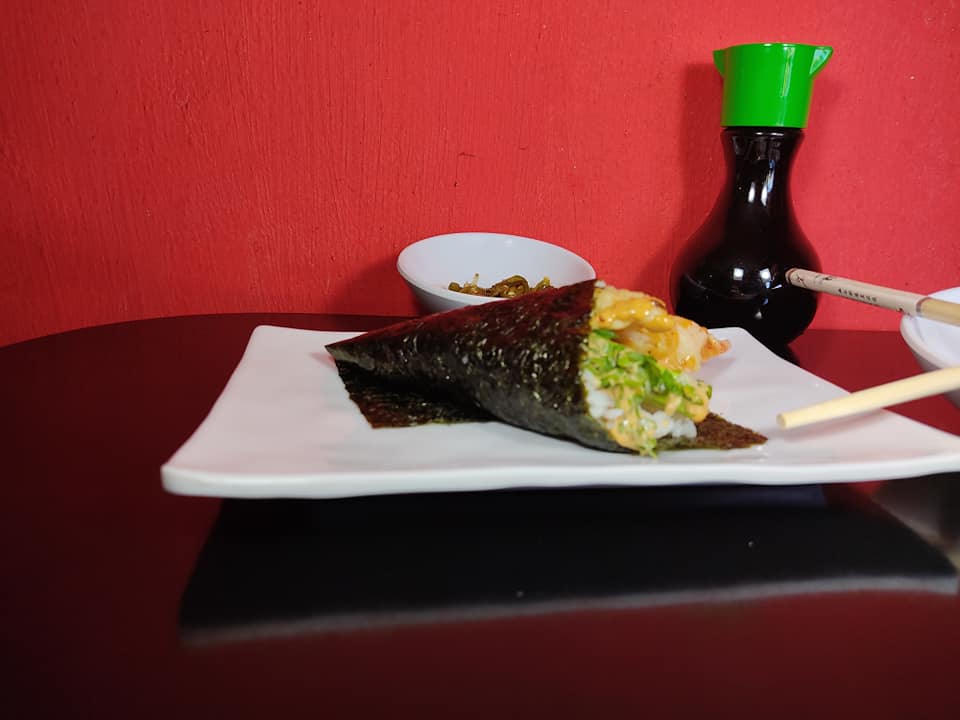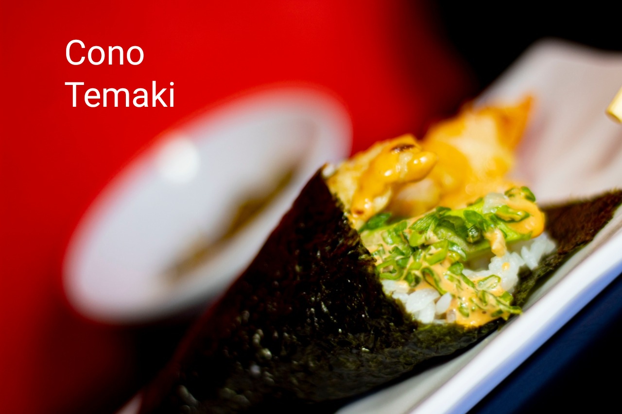 Cono con relleno de spicy tuna, aguacate y cebollín.