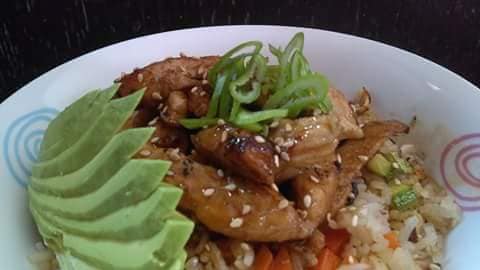 Platillo con base de arroz blanco, tiras de pechuga de pollo azadas con salsa agridulce.