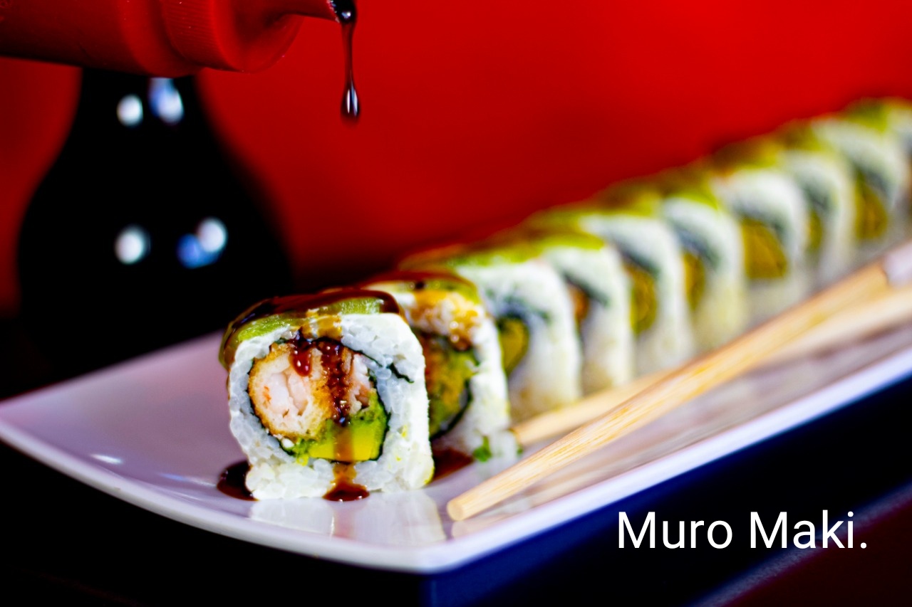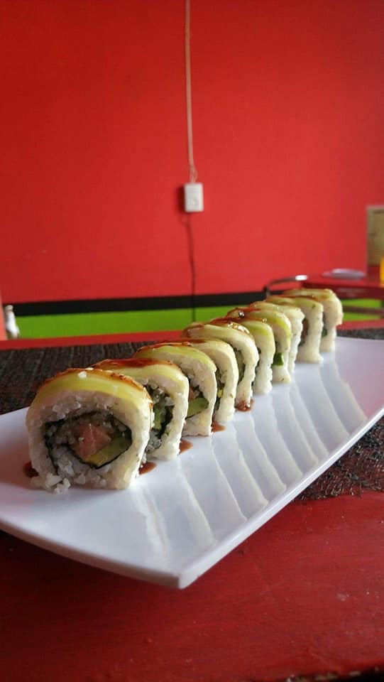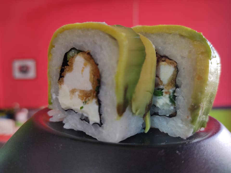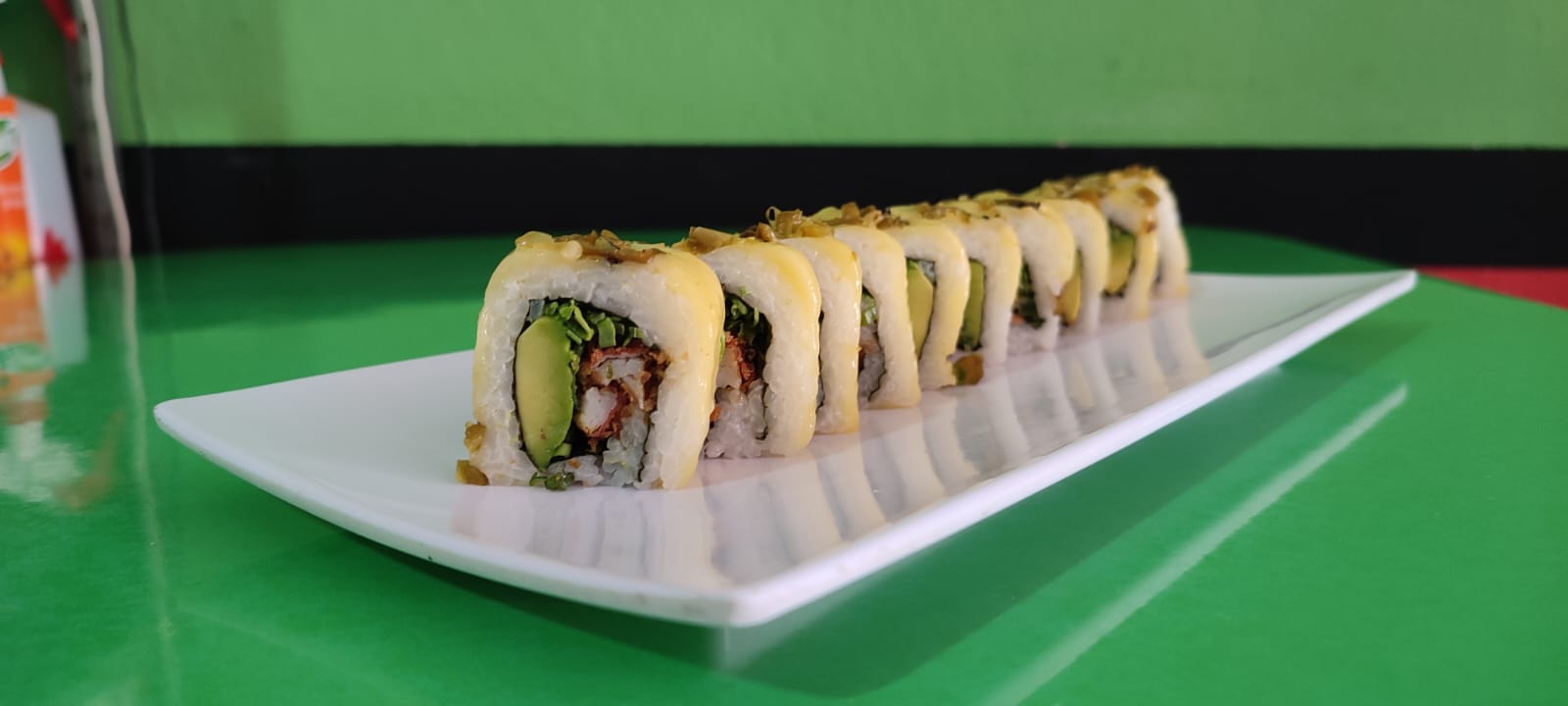 Rollo elaborado con aguacate por afuera relleno de pepino, queso crema, surimi un topping de spicy tuna y cebollín bañado en nuestra salsa teriyaki.