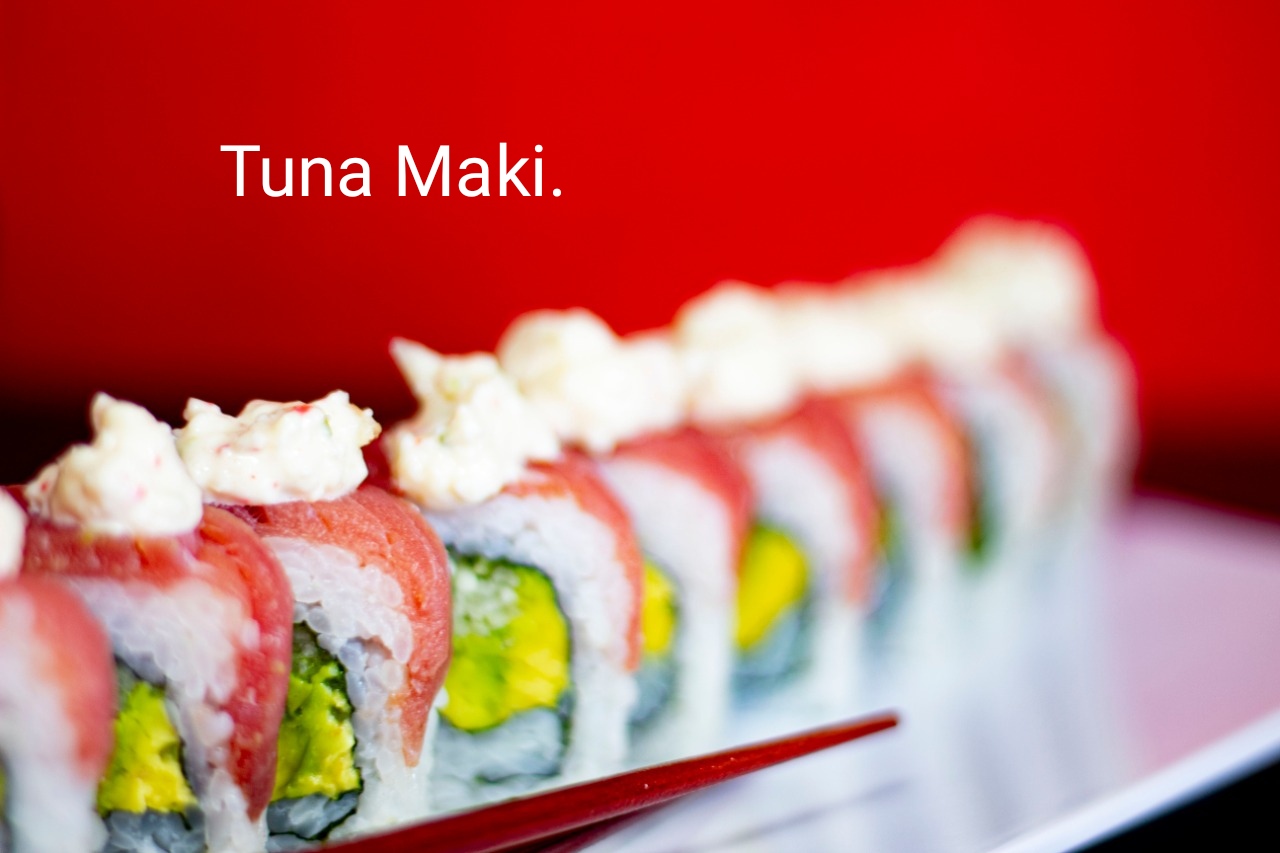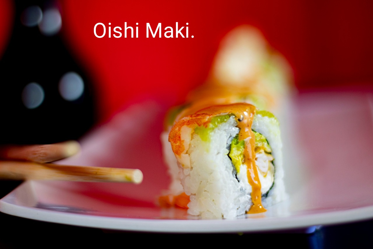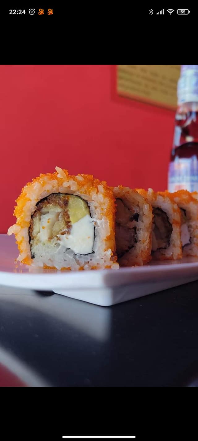 Rollo elaborado con aguacate por afuera relleno de pepino, queso crema, surimi un topping de spicy tuna y cebollín bañado en nuestra salsa teriyaki.