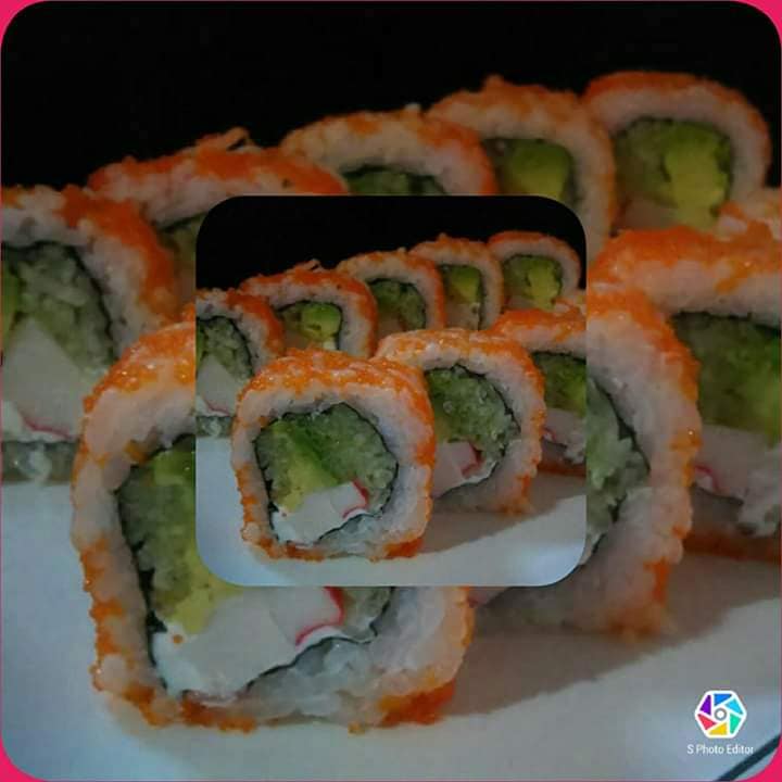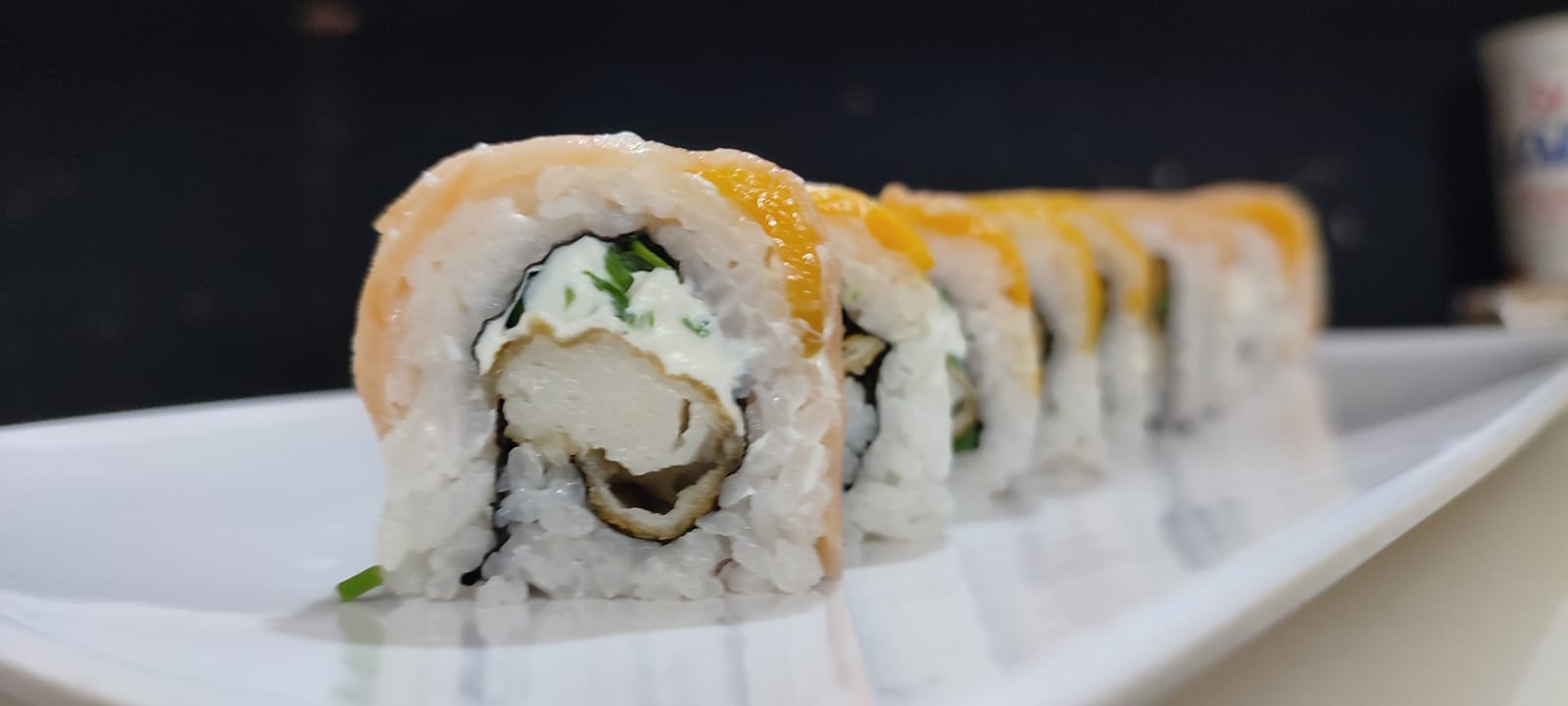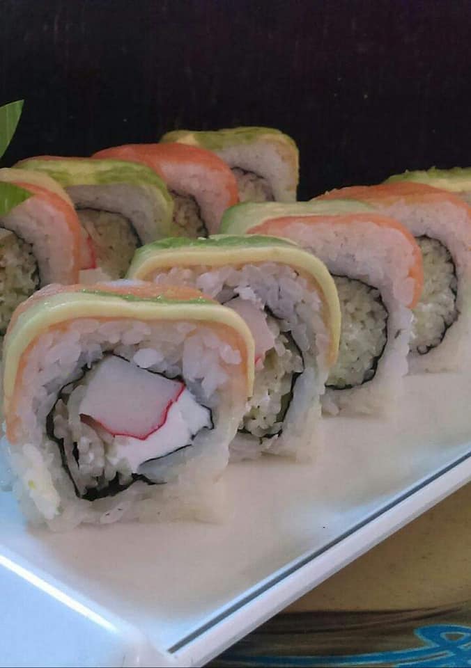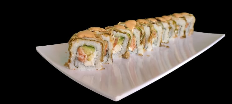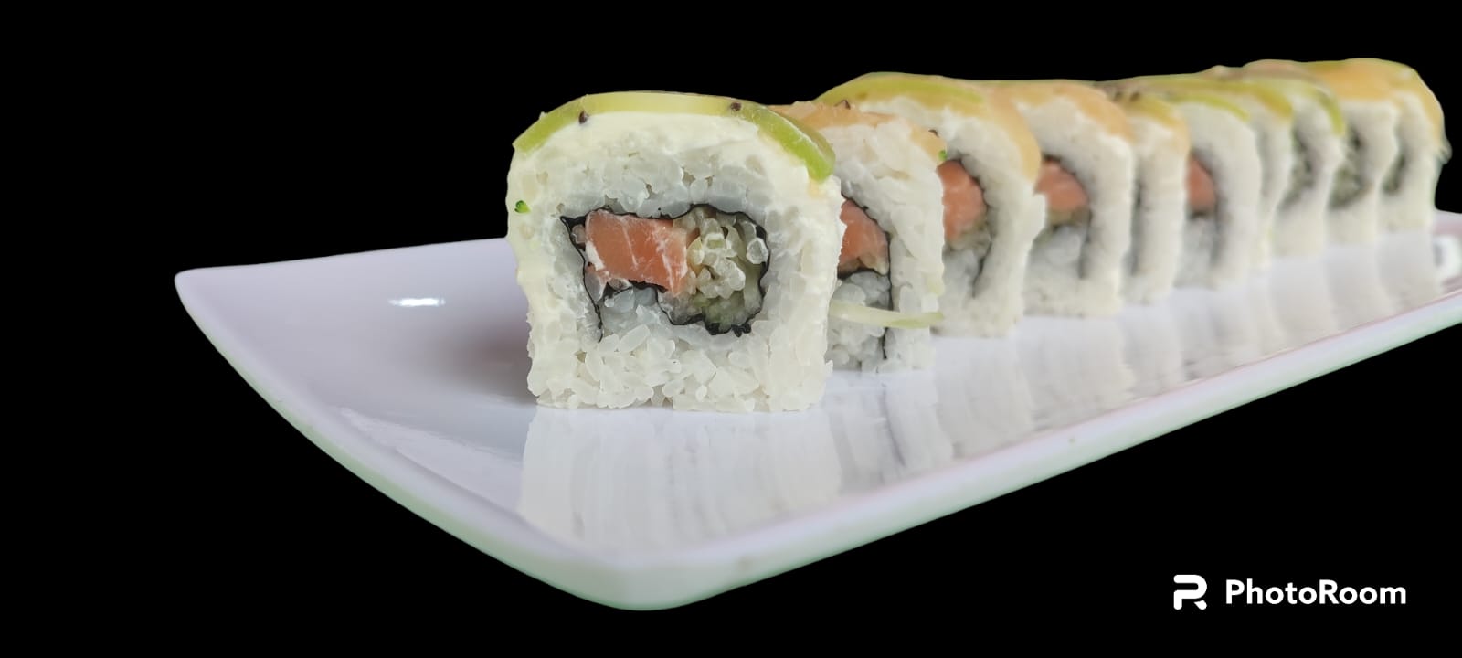 Salmón fresco, aguacate, surimi, queso crema, pepino y encima aderezo de tampico.
