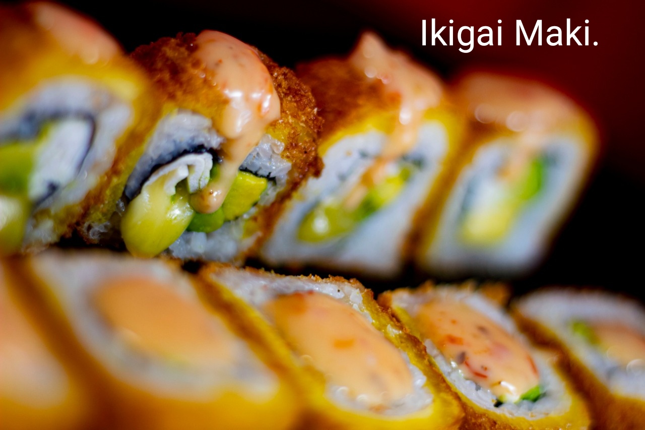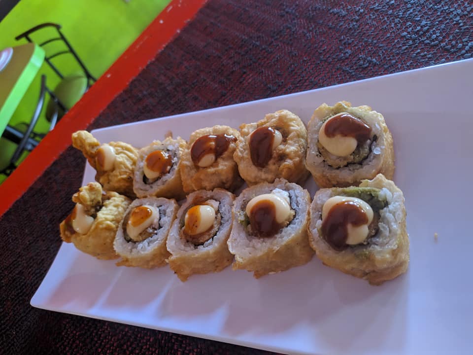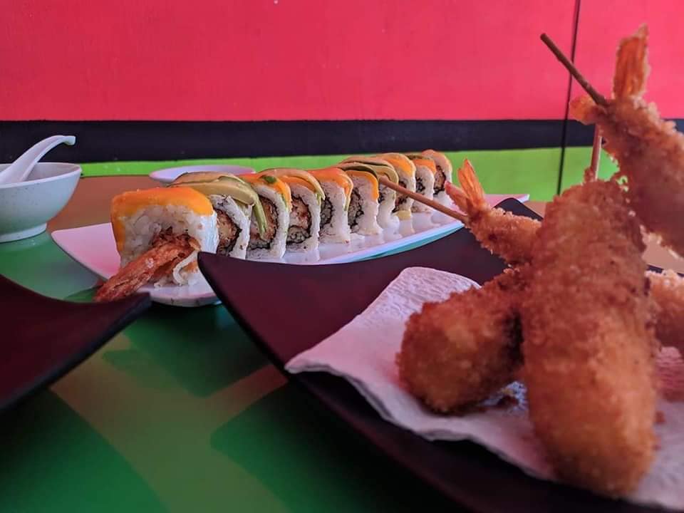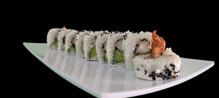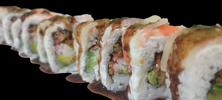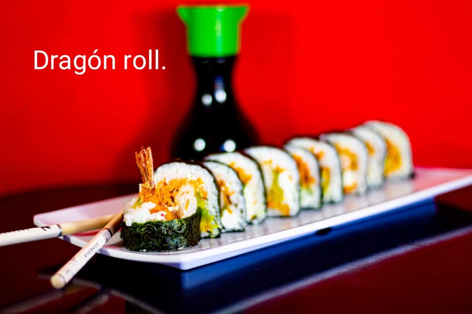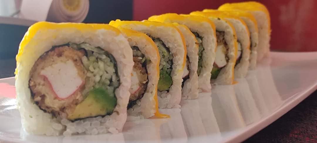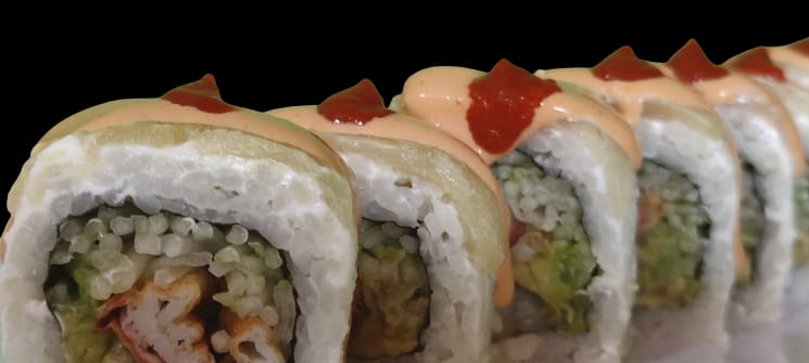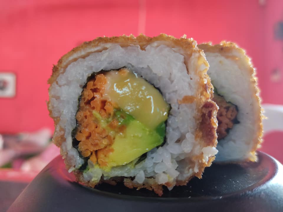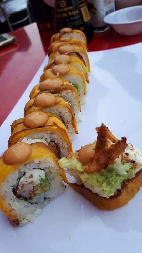 El rollo capeado con camarón empanizado, aguacate, queso crema, aderezo de limón y salsa tamarindo.