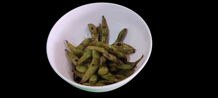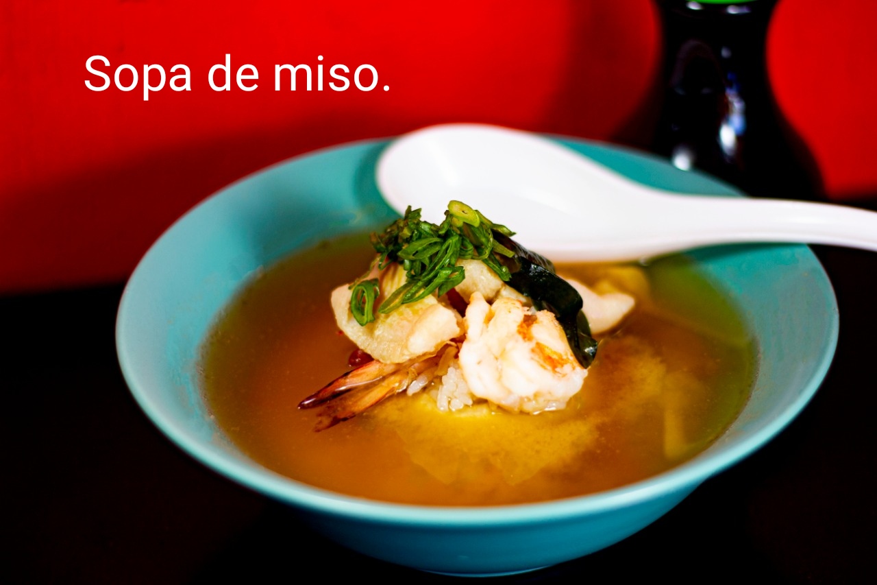 Fondo de frijol de soya con camarón, pescado, cebollín y arroz.