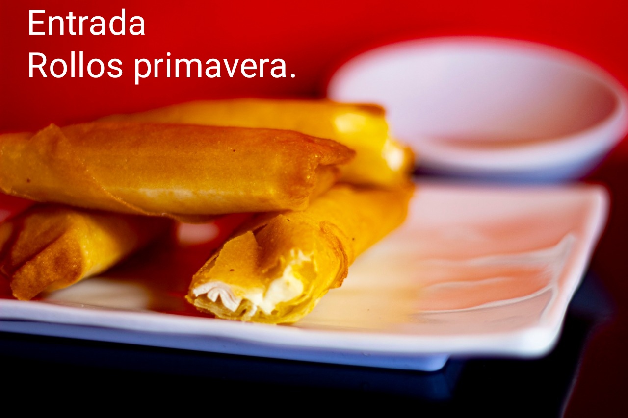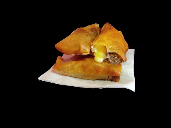 Dos rollos fritos rellenos de queso gouda, queso y filete de res con su salsa thai