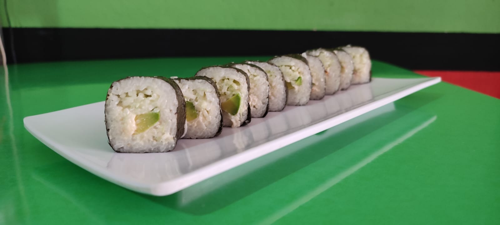 10 bocados de sushi aderezo de surimi, aguacate y pepino. Platillo personal