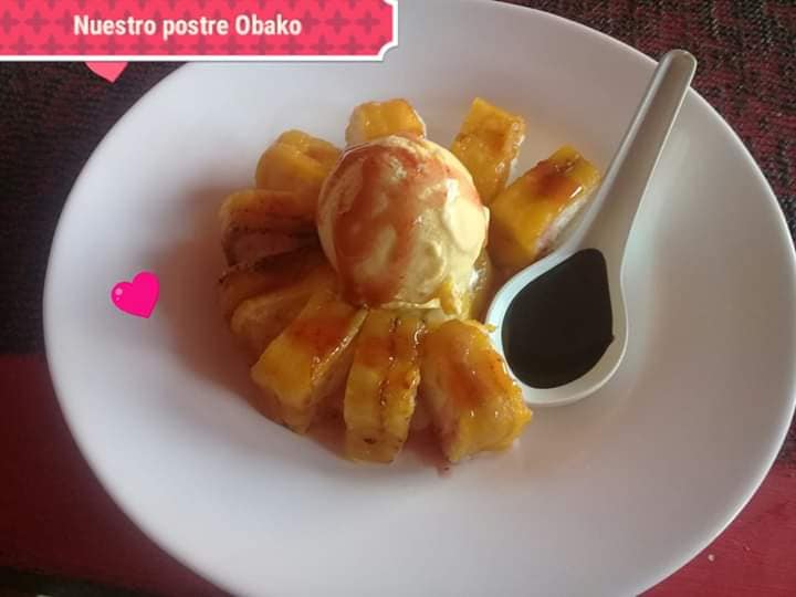 Rollo de arroz con rebanadas de plátano frito relleno de queso crema acompañado de helado de vainilla bañado en chocolate