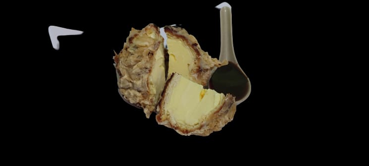 Rollo empanizado con camarón empanizado, queso gouda, aguacate, queso crema y salsa kushiague.