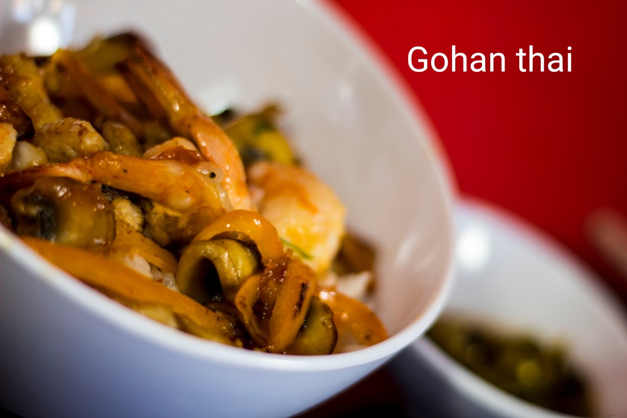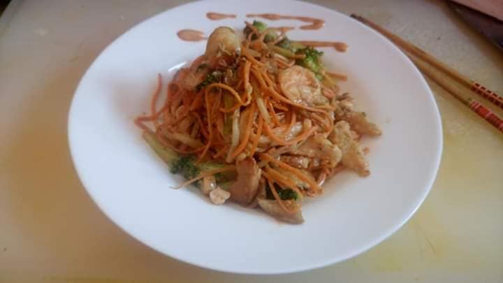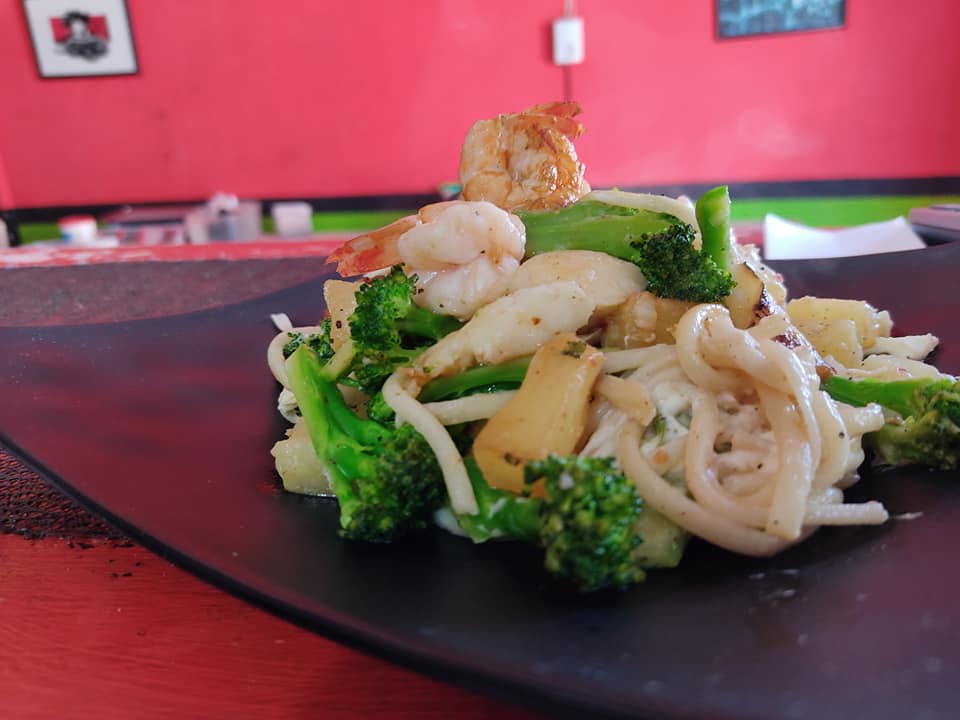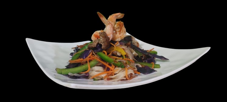 Pasta de arroz tailandesa con filete de res camarón col morada pimiento zanahoria y nuestra salsa thai.
