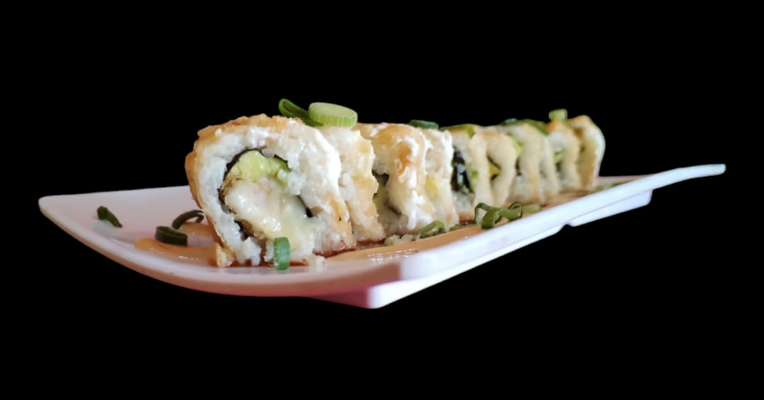 Rollo capeado con camarón empanizado, queso gouda, aguacate, queso crema, aderezo oriental, tamarindo y cebollín.
