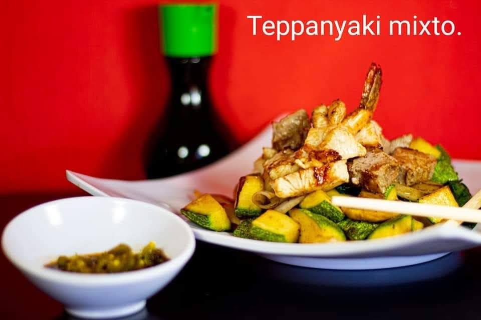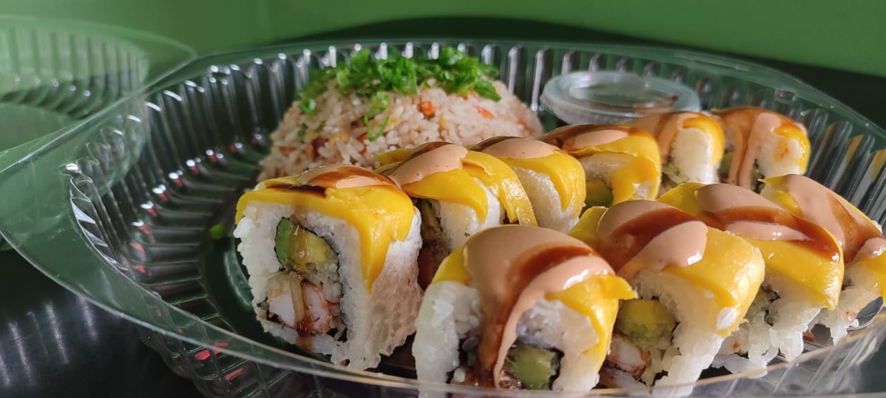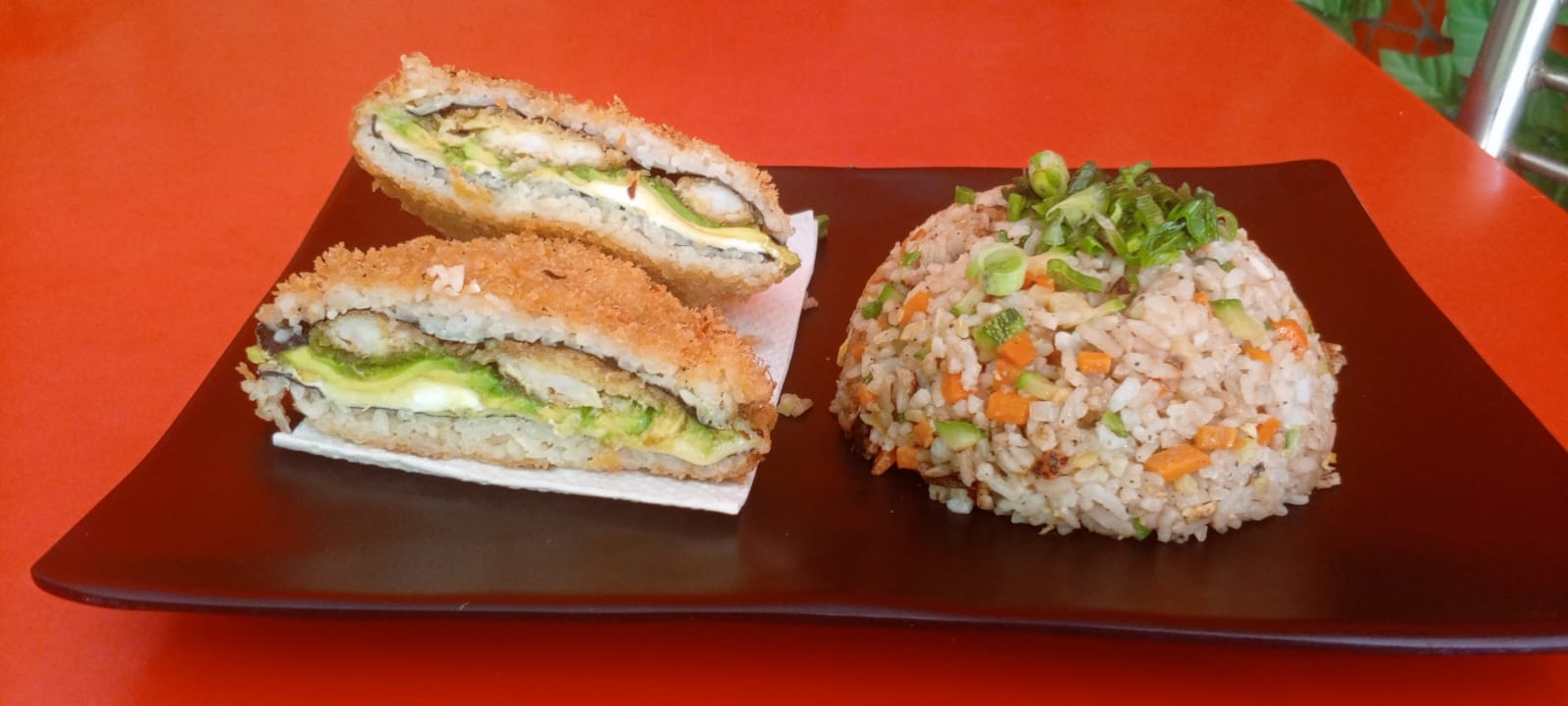 1 yakimeshi de verduras, 1 rollo zapata (mango, queso crema, surimi empanizado, aguacate, pepino, aderezo chipotle y salsa dulce)