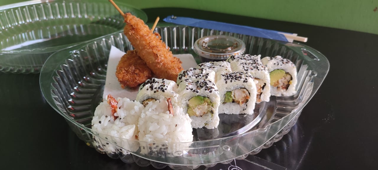 Paquete con un Kenko relleno de camarón empanizado, aguacate, queso crema, queso gouda, aderezo chipotle y salsa kushiague con porción de yakimeshi de verduras.