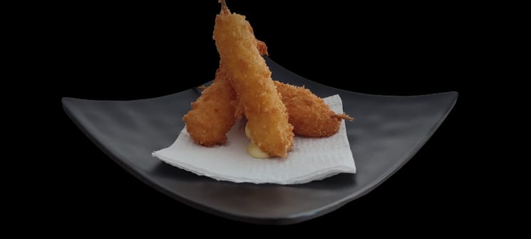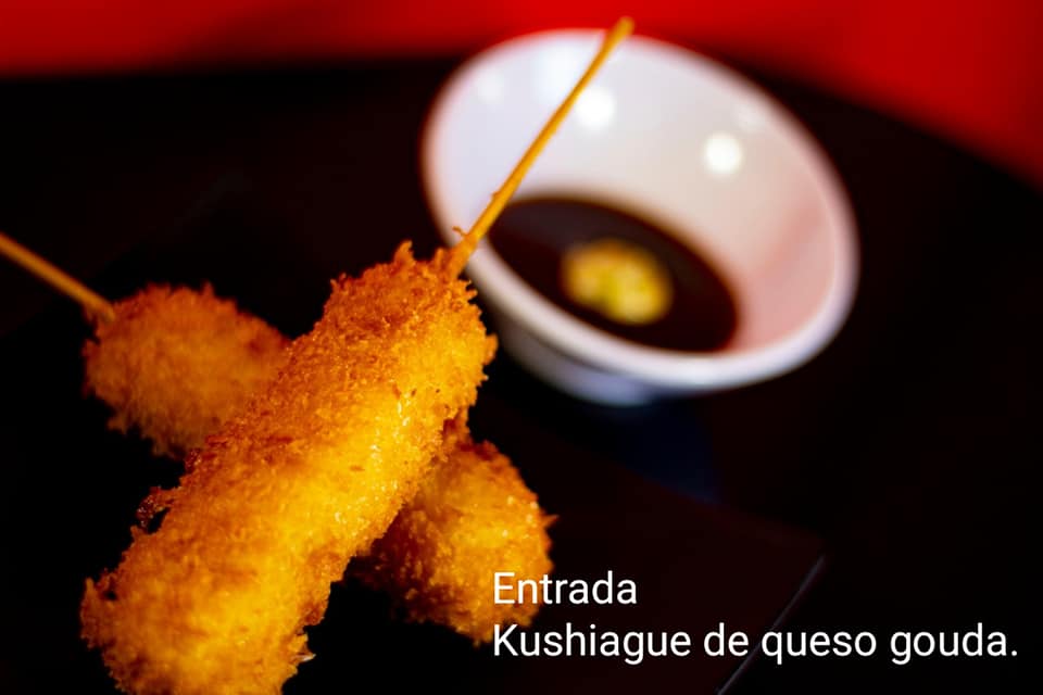 1 pza brocheta platano empanizada, 1 pza brocheta queso gouda empanizada, 1 rollo chef (queso crema, ajonjoli negro, aguacate, y salsa dulce)