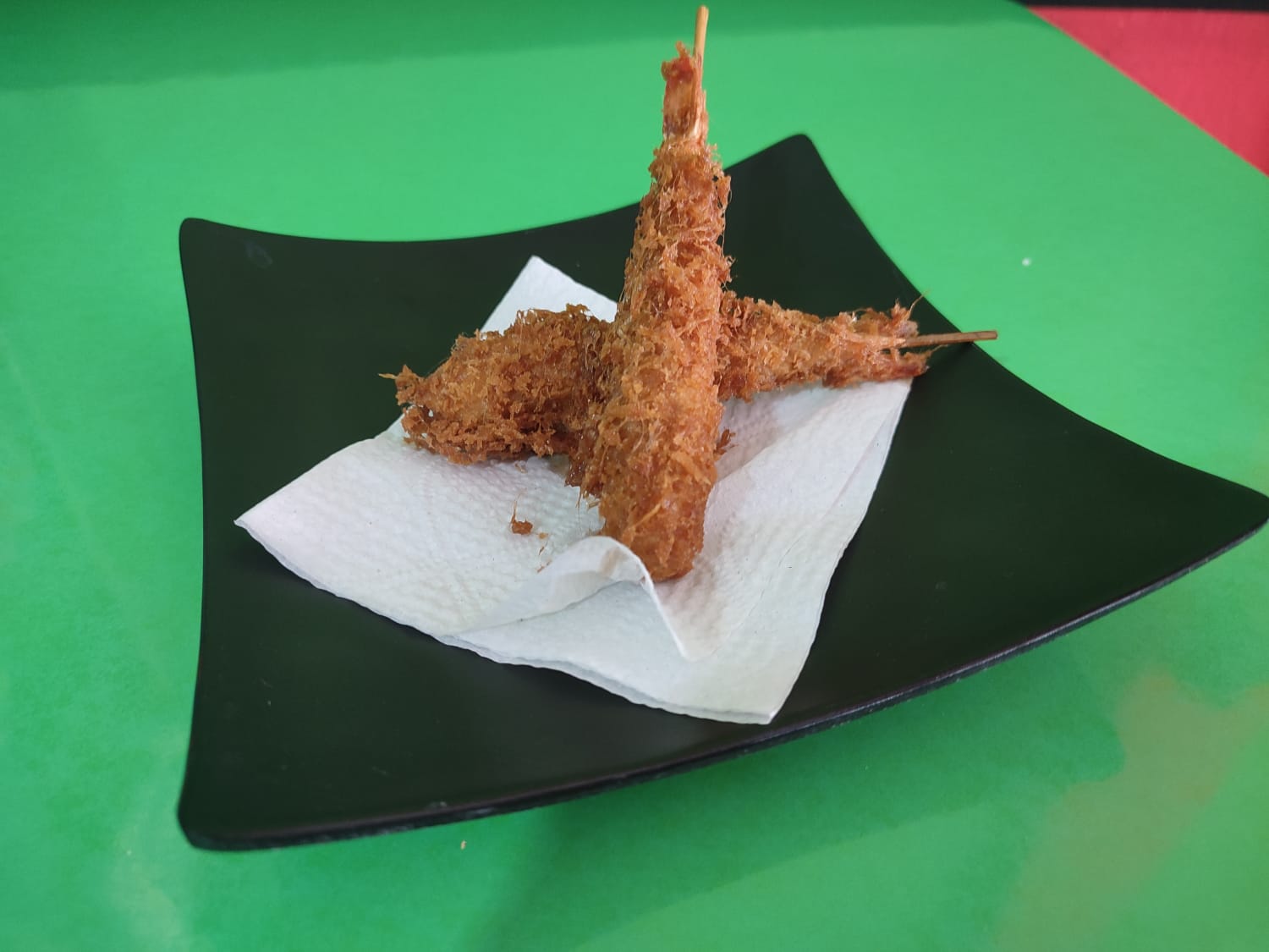 Plátano frito, queso crema, camarón empanizado, aguacate y aderezo de chipotle.