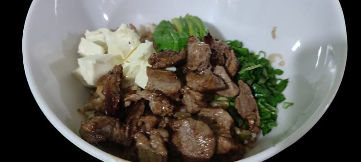 Arroz frito de verduras con trozos de queso crema rebanada de aguacate filete de res y cebollín con nuestro chipotle