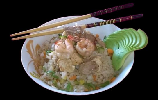 Tradicional arroz frito con huevo, calabaza, zanahoria, cebolla y un ingrediente de tu elección.