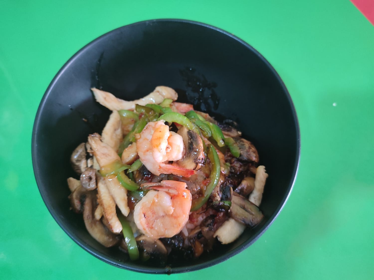 Tazón de arroz blanco con camarón, tiras de pollo azadas, pimiento, champiñón, sazonadas con salsa de chile dulce.