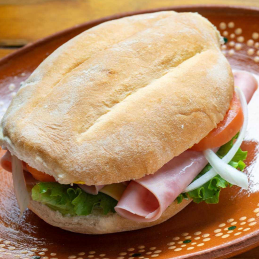 telera normal, jamon, mayonesa, jitomate, cebolla, lechuga, chiles
