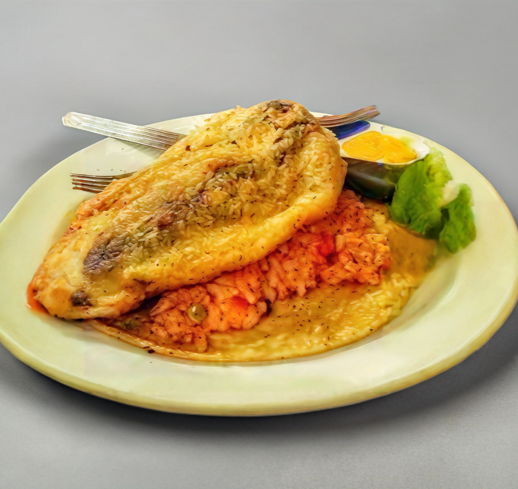 2 Tacos Acorazados grandes con una Tortilla extra de maíz HECHAS A MANO, arroz rojo de jitomate, 2 rollitos de jamón con queso oaxaca, capeados con huevo y salsa a elegir.