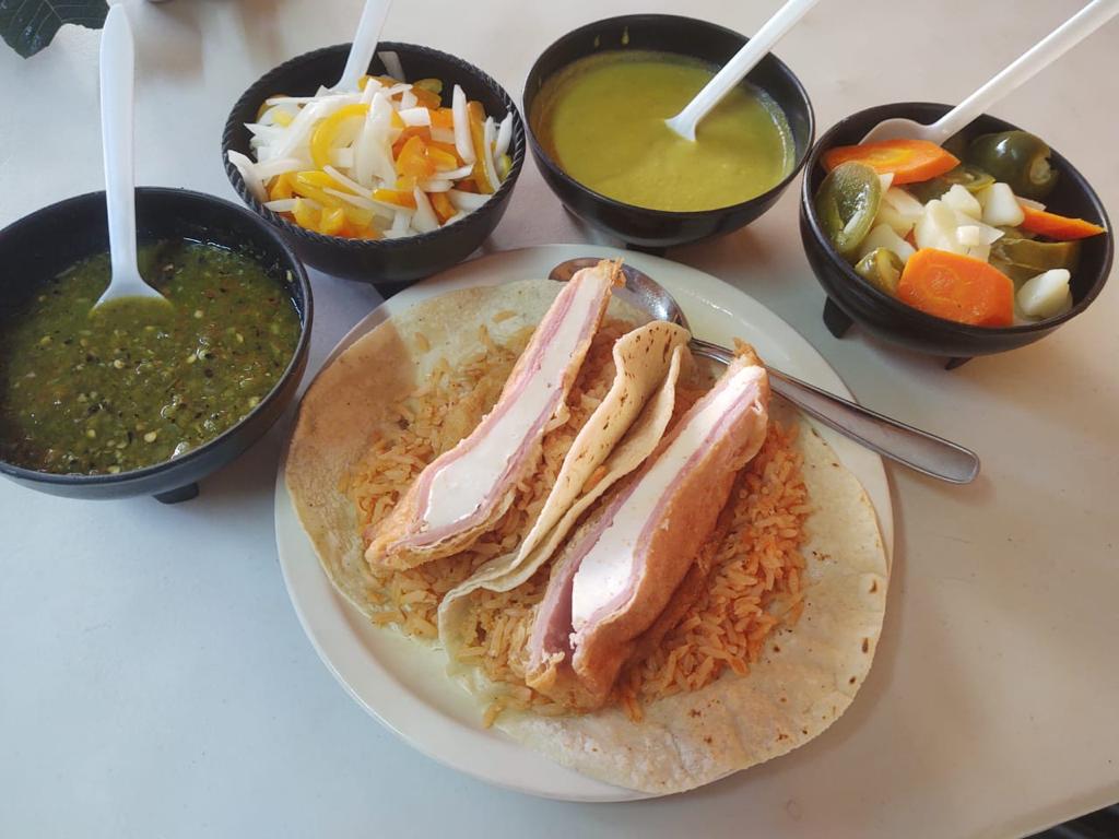 Dos tortillas con arroz y un rollito de jamón de pavo, con queso panela capeado.