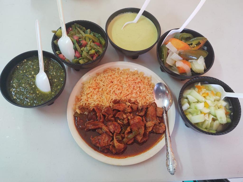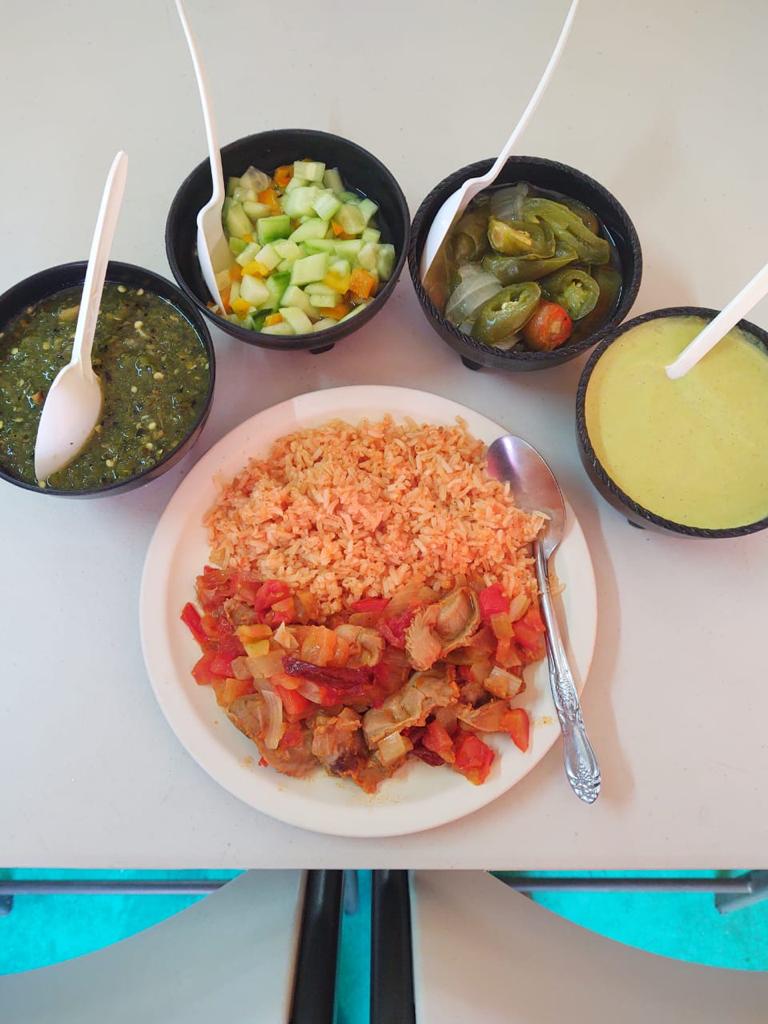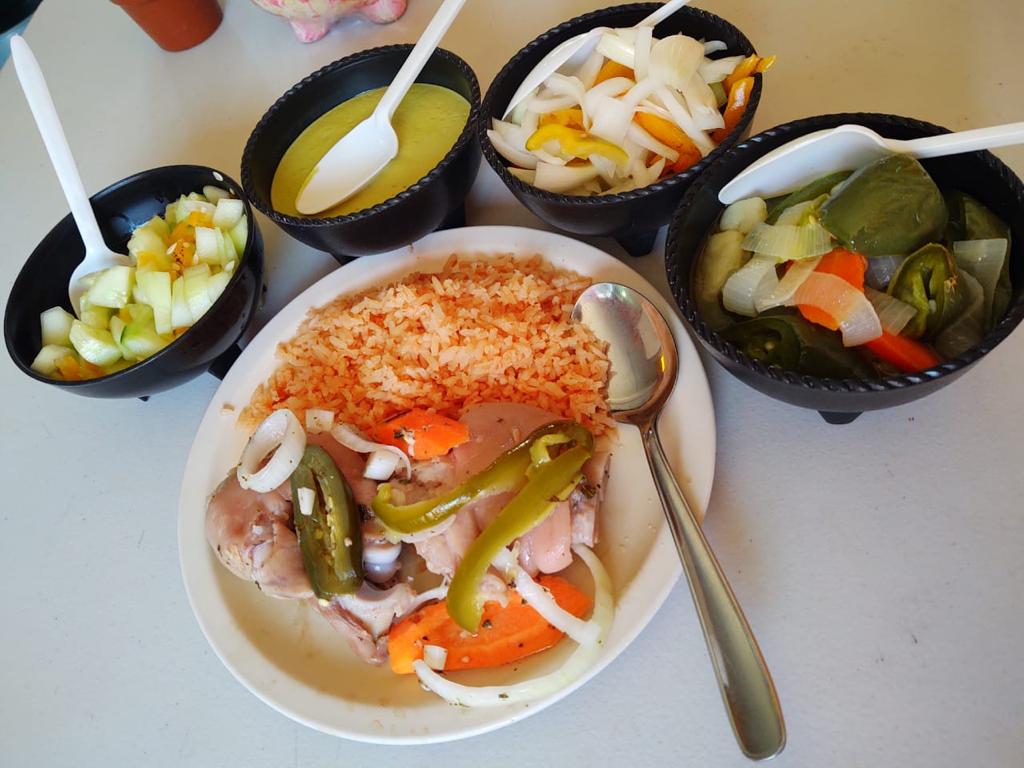 1 pollo con mole rojo almendrado con arroz rojo.