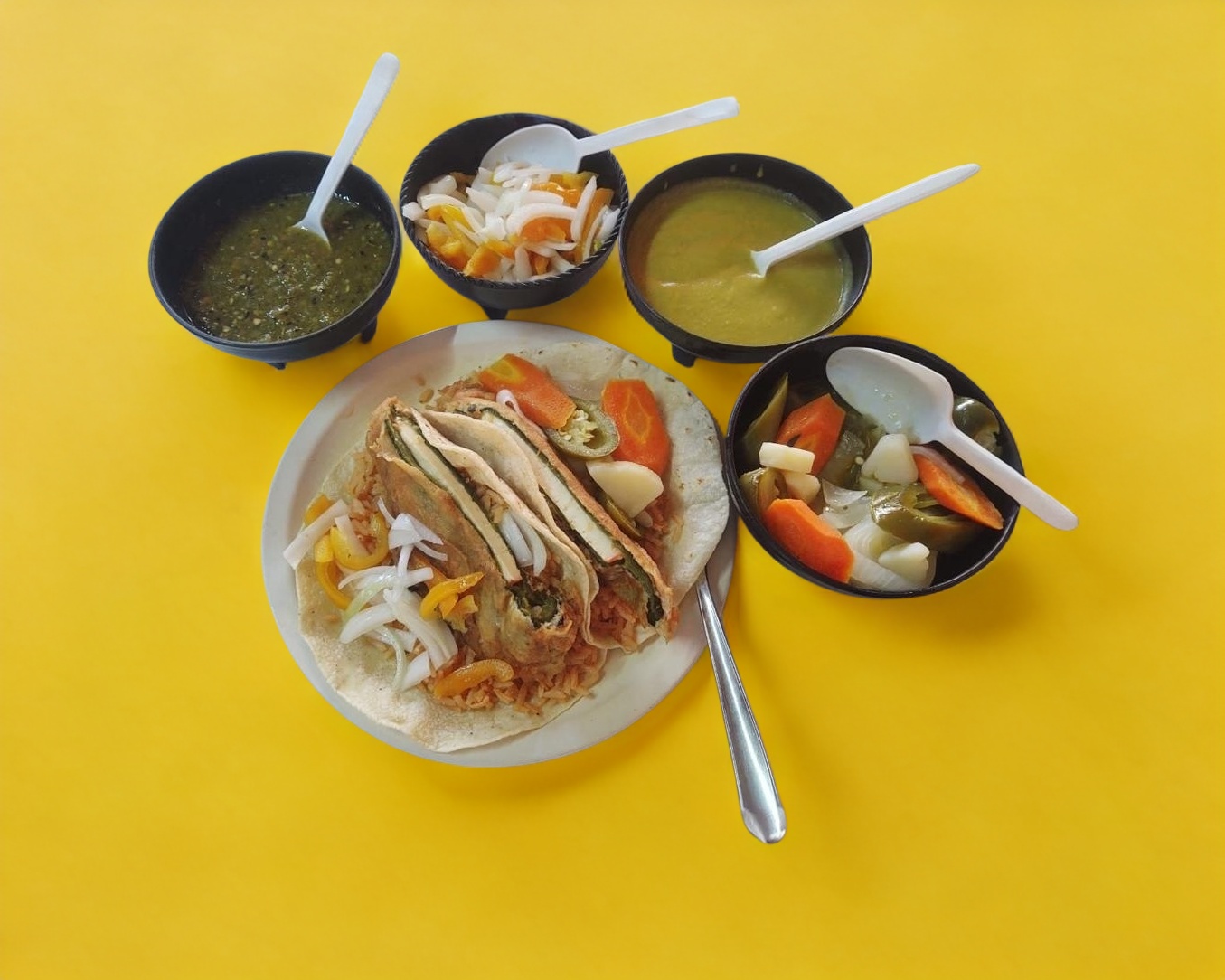 Dos tortillas con arroz y chile poblano capeado relleno de queso de cincho.