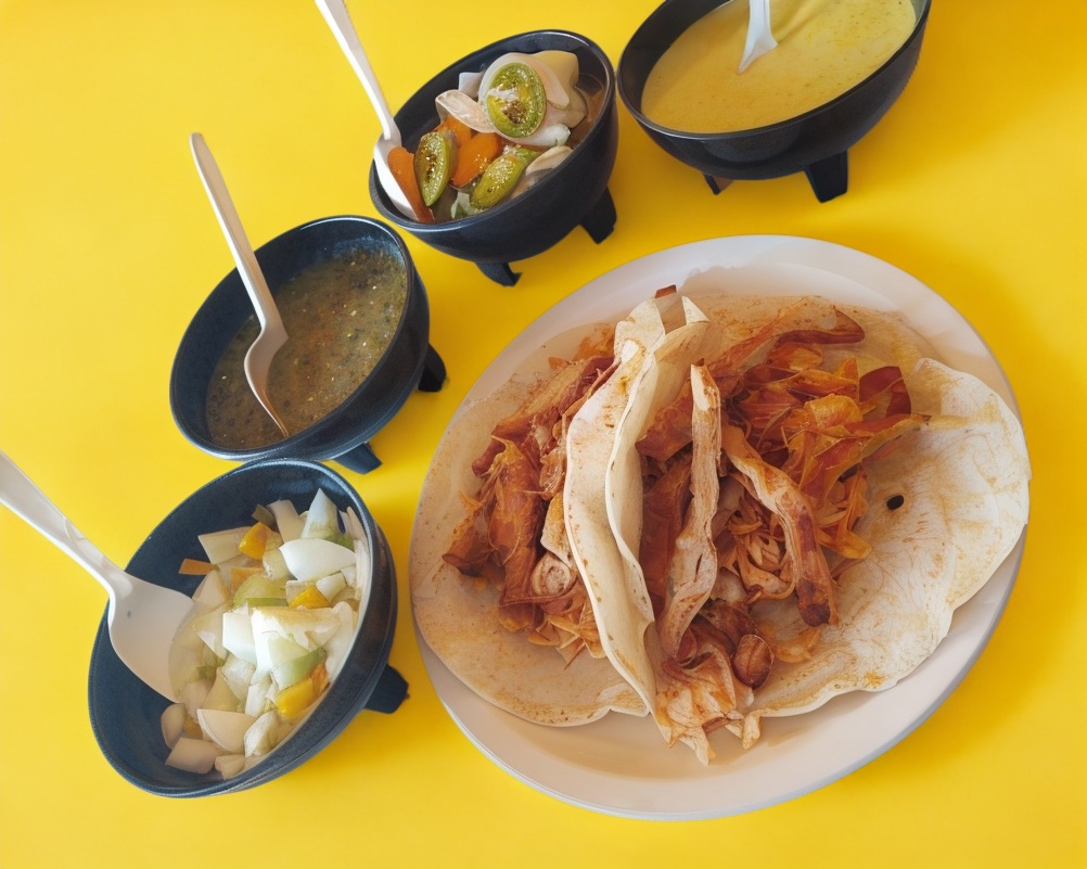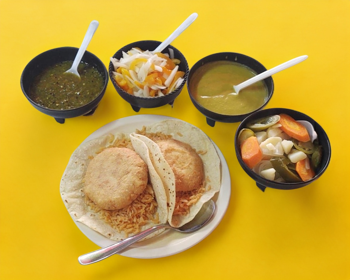 Doble tortilla de maiz con una pieza de torta de papa y arroz. Salsas y chile picado por separado.
