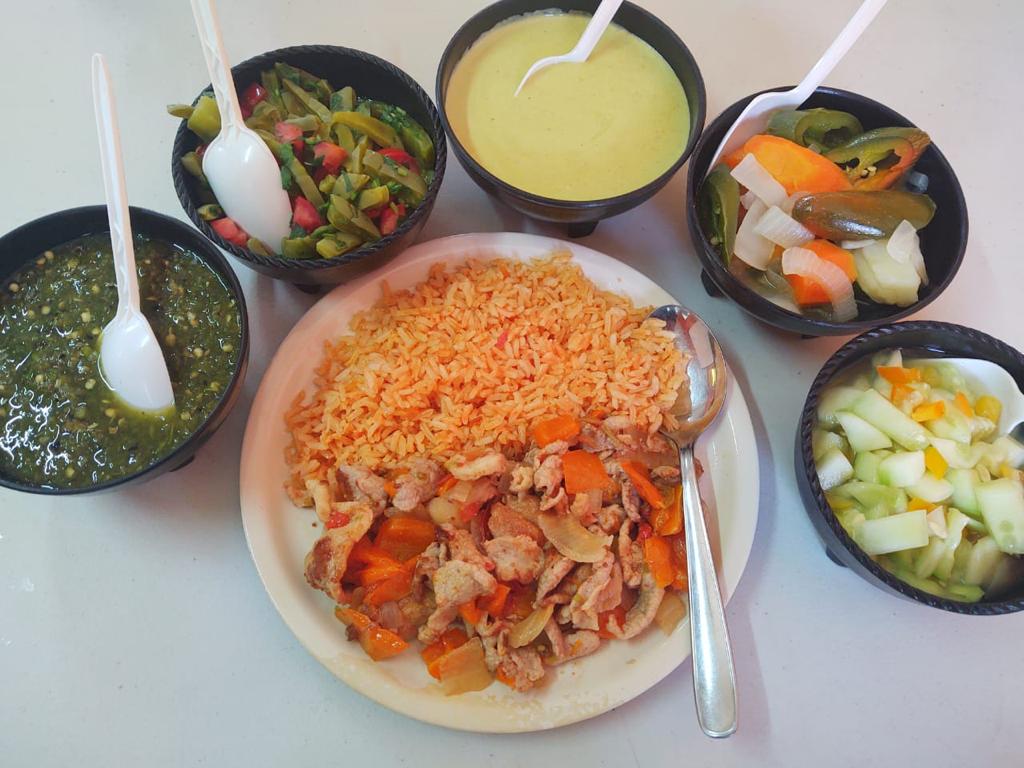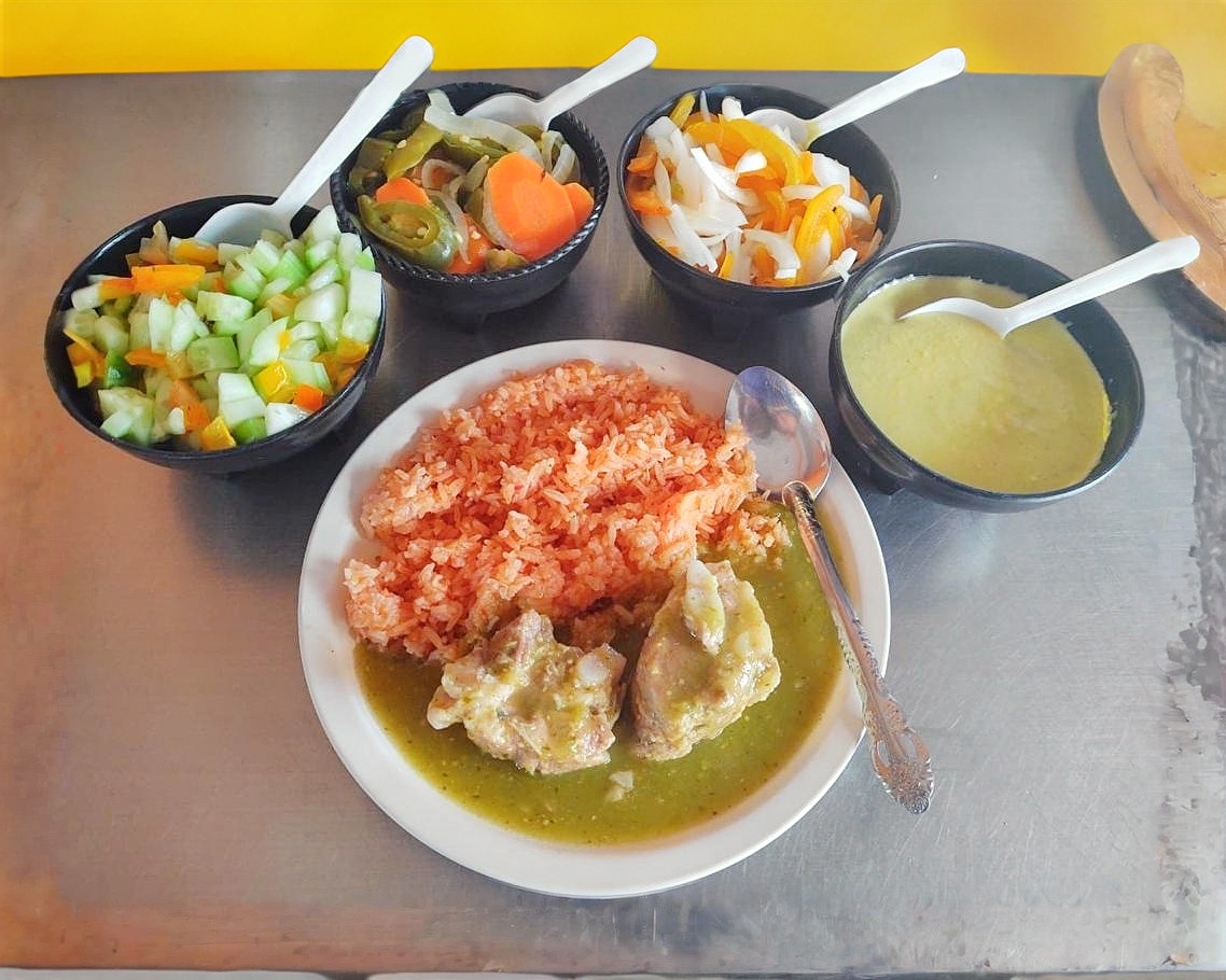 Dos tortillas con arroz con costilla, en salsa de verde.