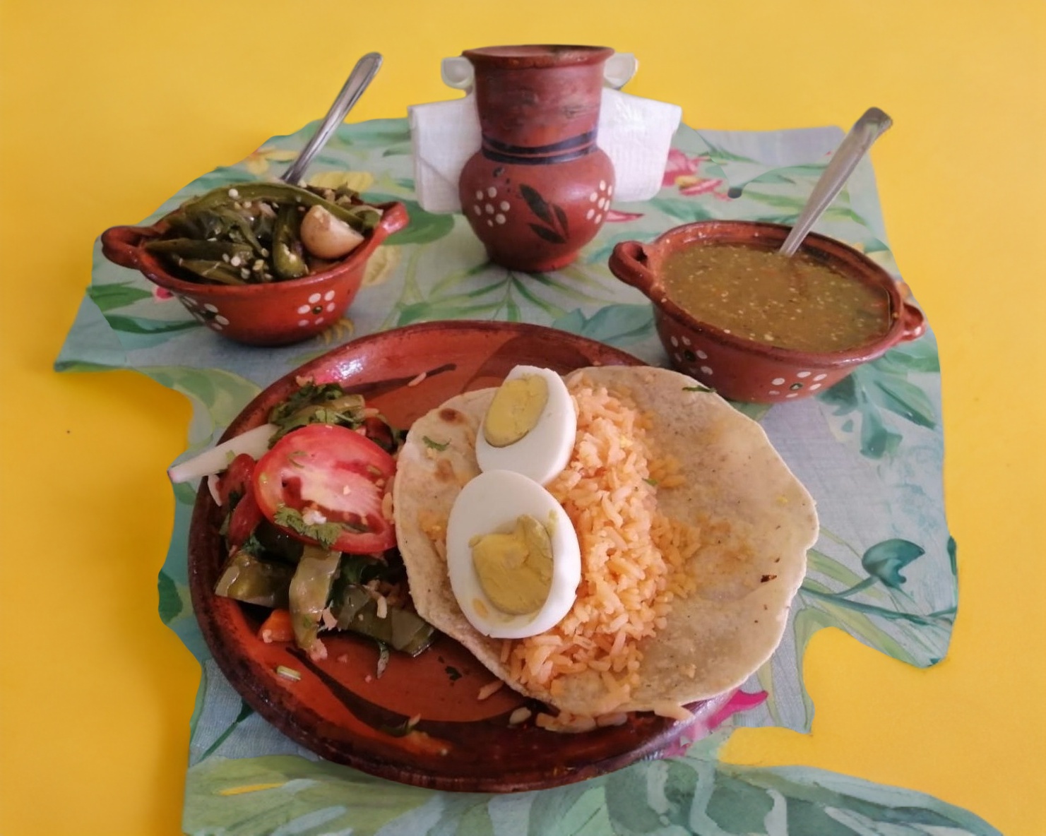 Acompañado con tortilla a mano, delicioso arroz, salsa