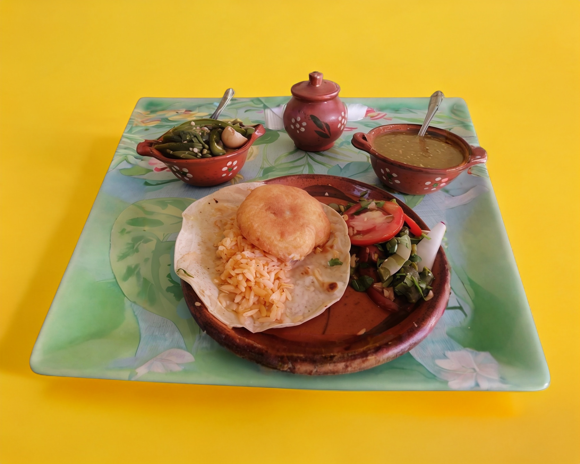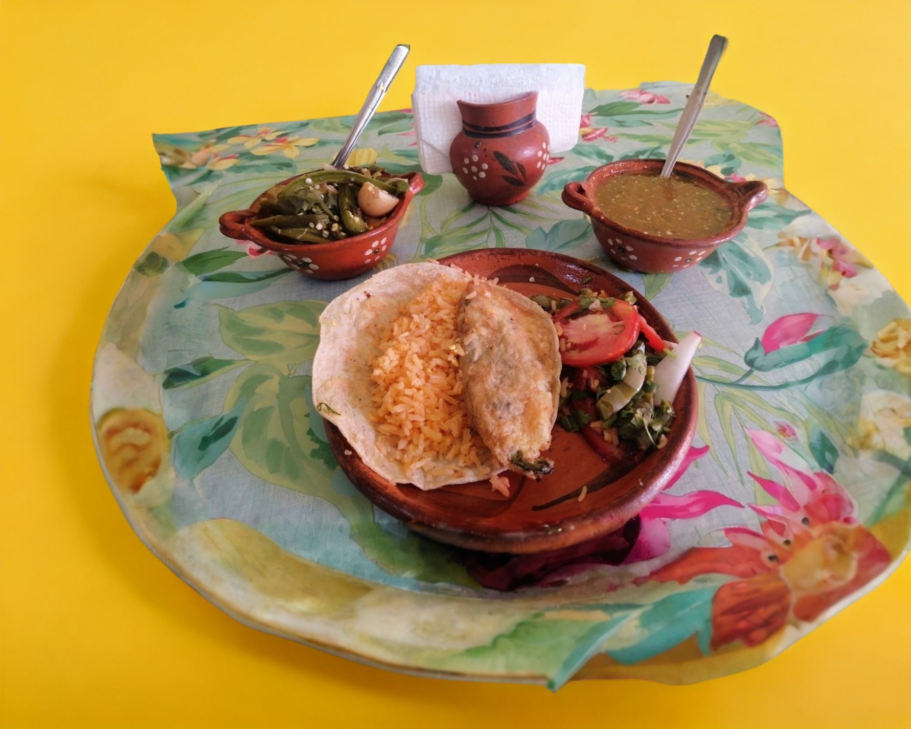 Acompañado con tortilla a mano, delicioso arroz, salsa y rajas.