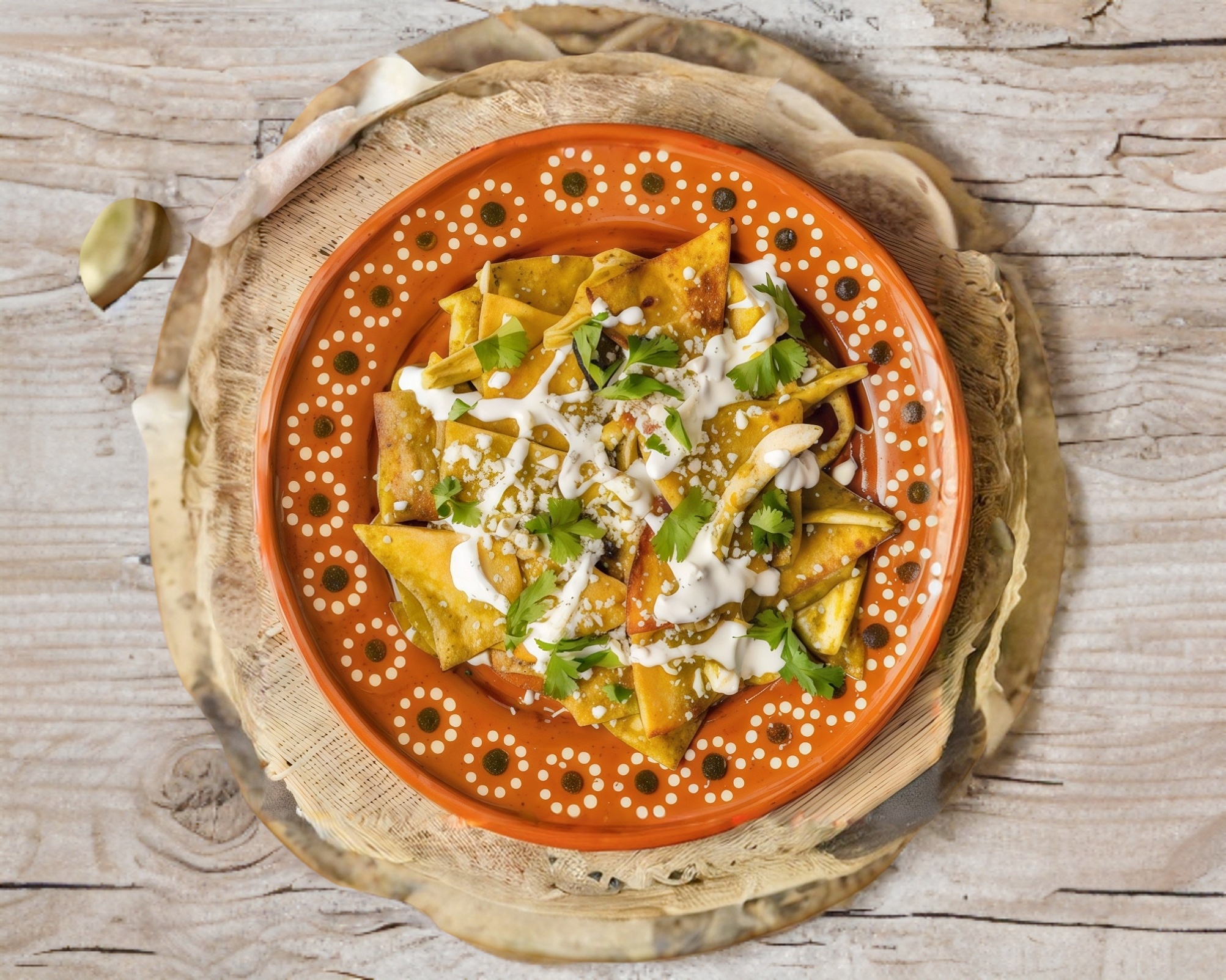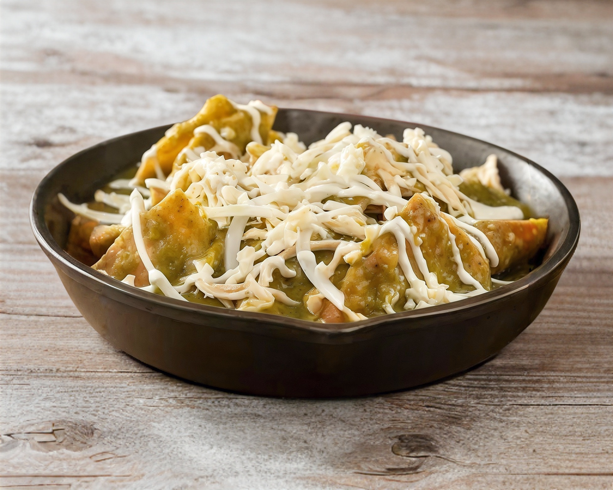 Chilaquiles verdes individuales con Crema, Queso, Cebolla y Aguacate,