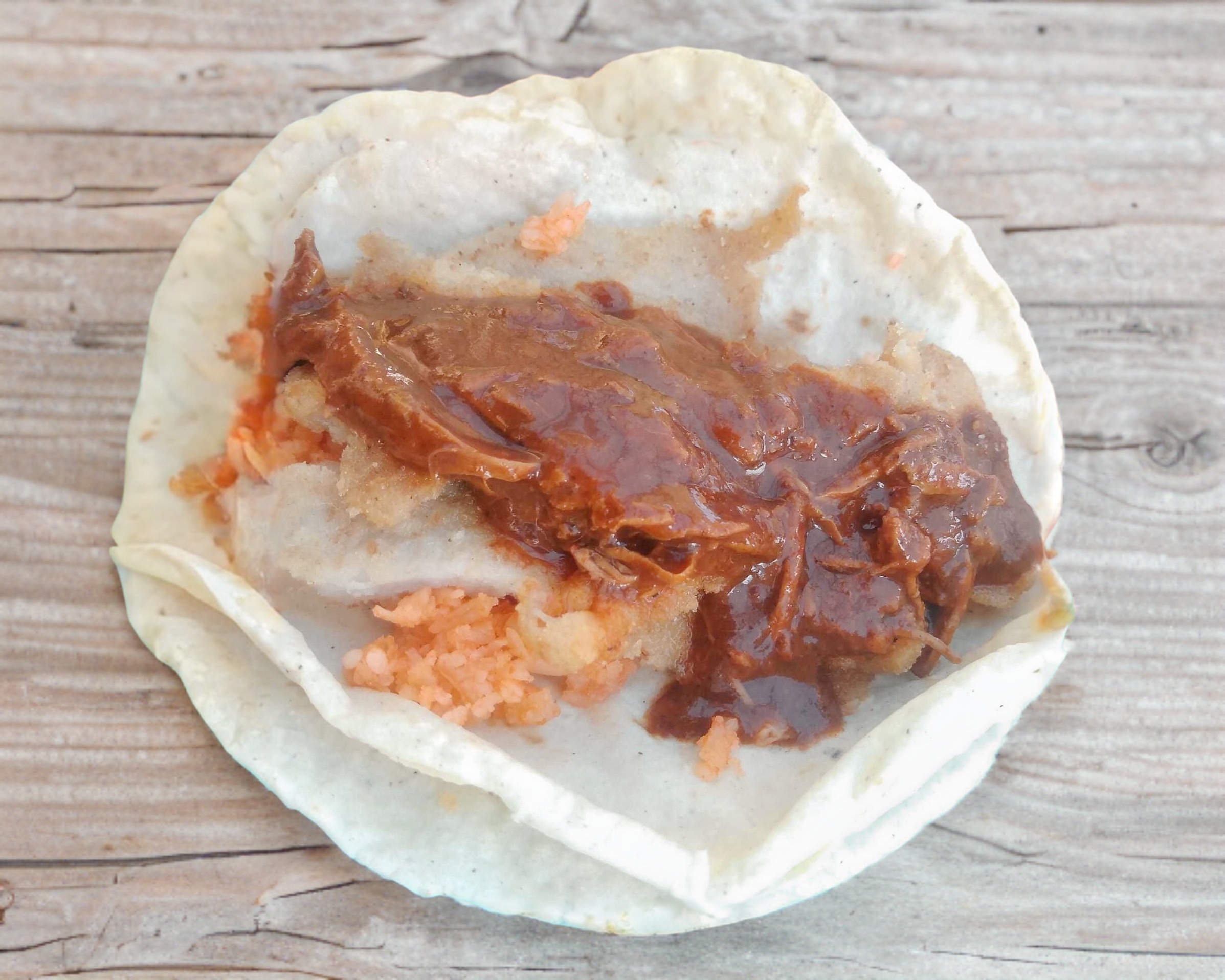Taco acorazado con arroz, mole con pollo desmenuzado, salsa o rajas.