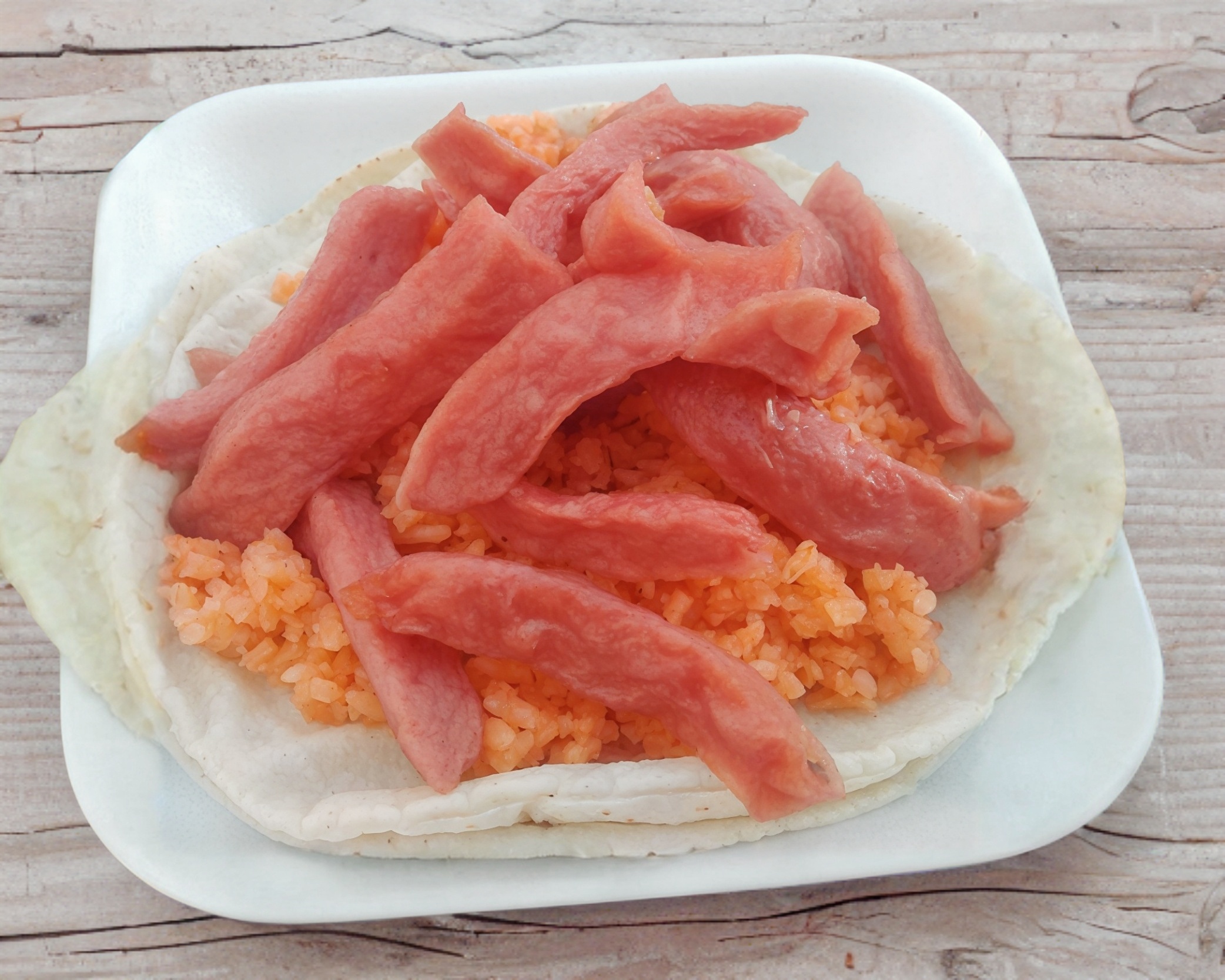 Taco acorazado con arroz, salchicha frita, salsa o rajas