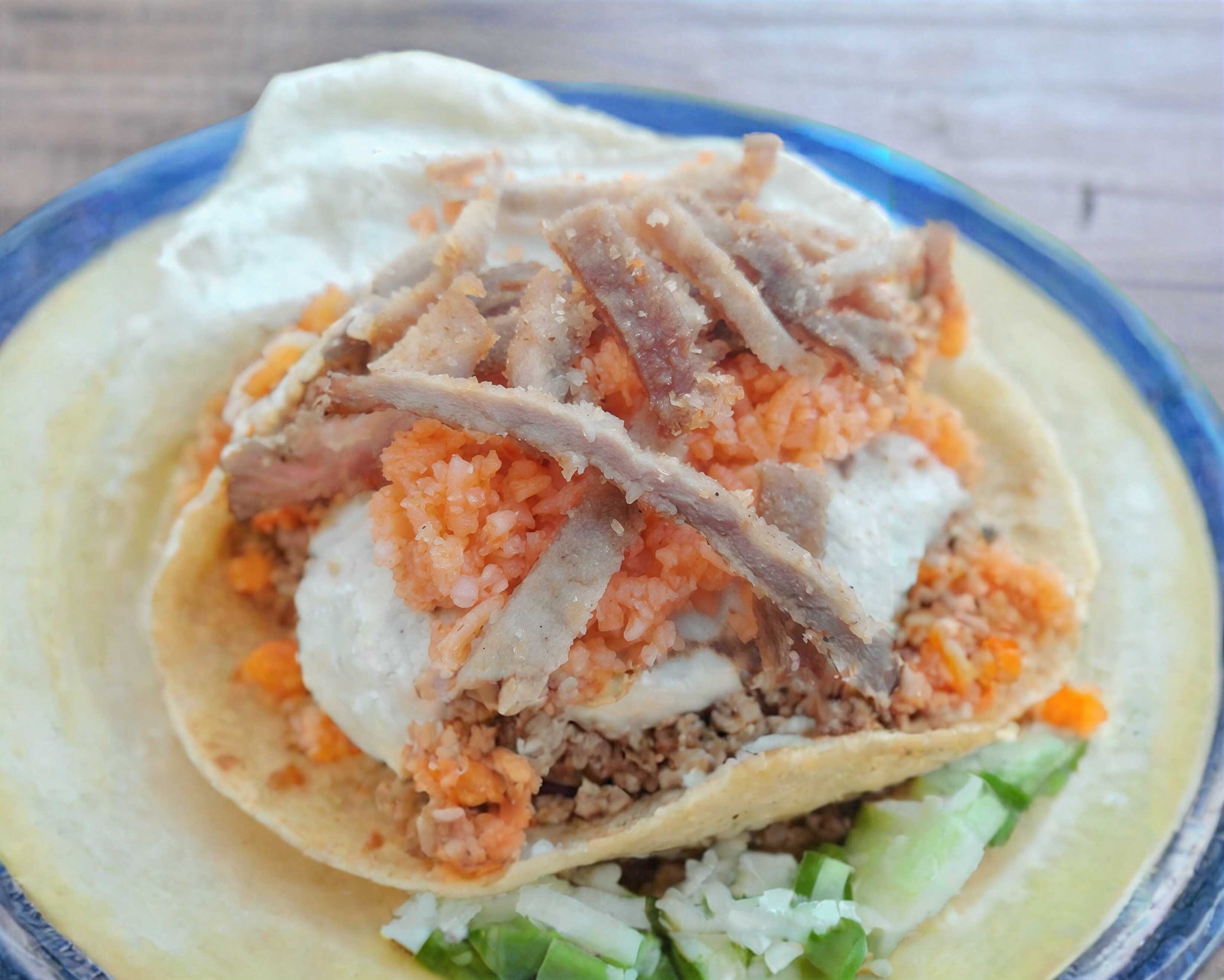 Taco acorazado con arroz, bistec de puerco en salsa de cacahuate, salsa o rajas