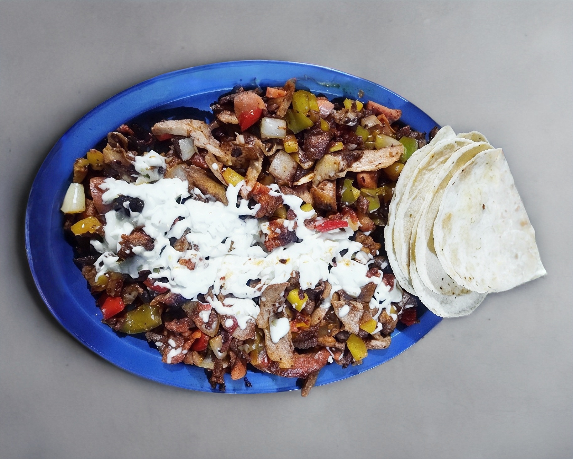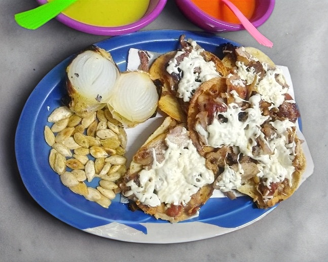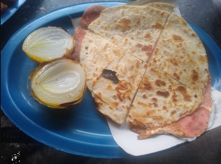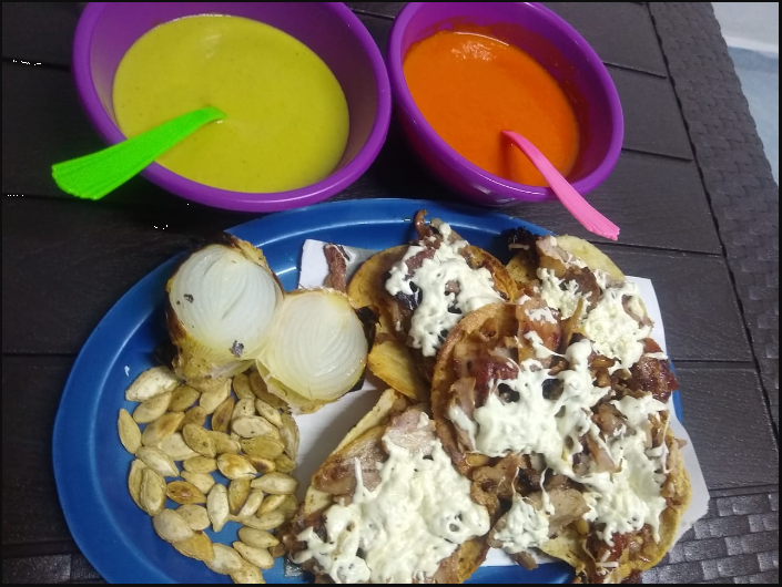 tortillas de maiz Carne al carbón estilo Iguala, morrón,cebolla, salchicha y queso