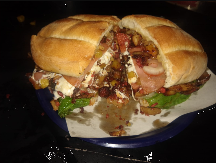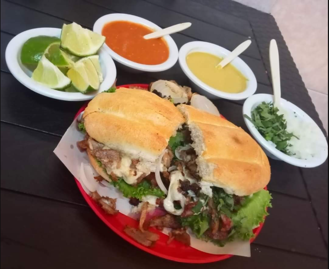 pan 450 gm Lechuga, tomate, cebolla, carne chuleta, carne al carbón y carne de longaniza y queso
