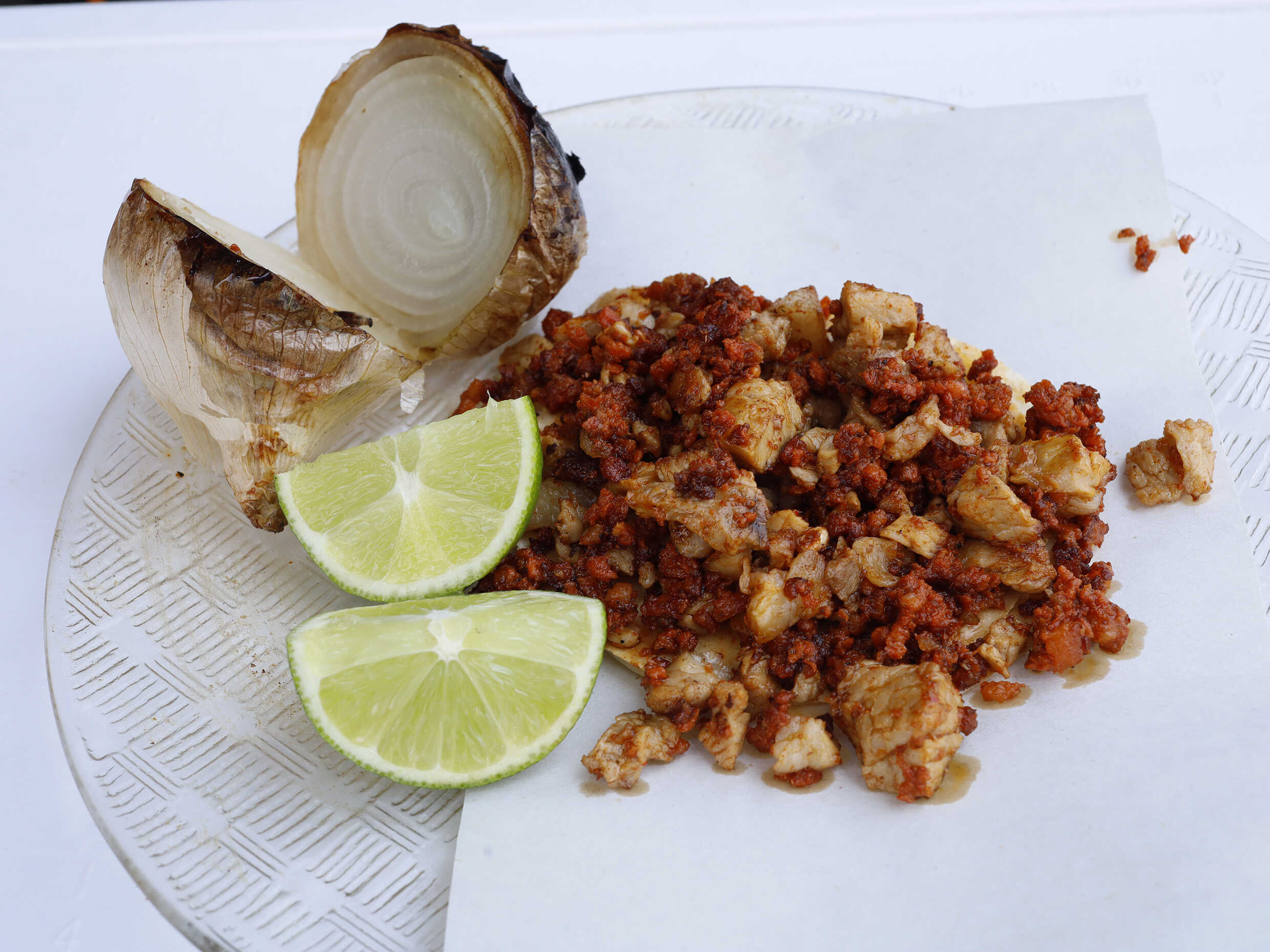Deliciosa tortilla doble de maíz rellena con carne doradita al carbón, jugosa y llena de sabor ahumado, acompañada con queso Oaxaca fundido. Incluye cebolla picada y salsas variada eleccion