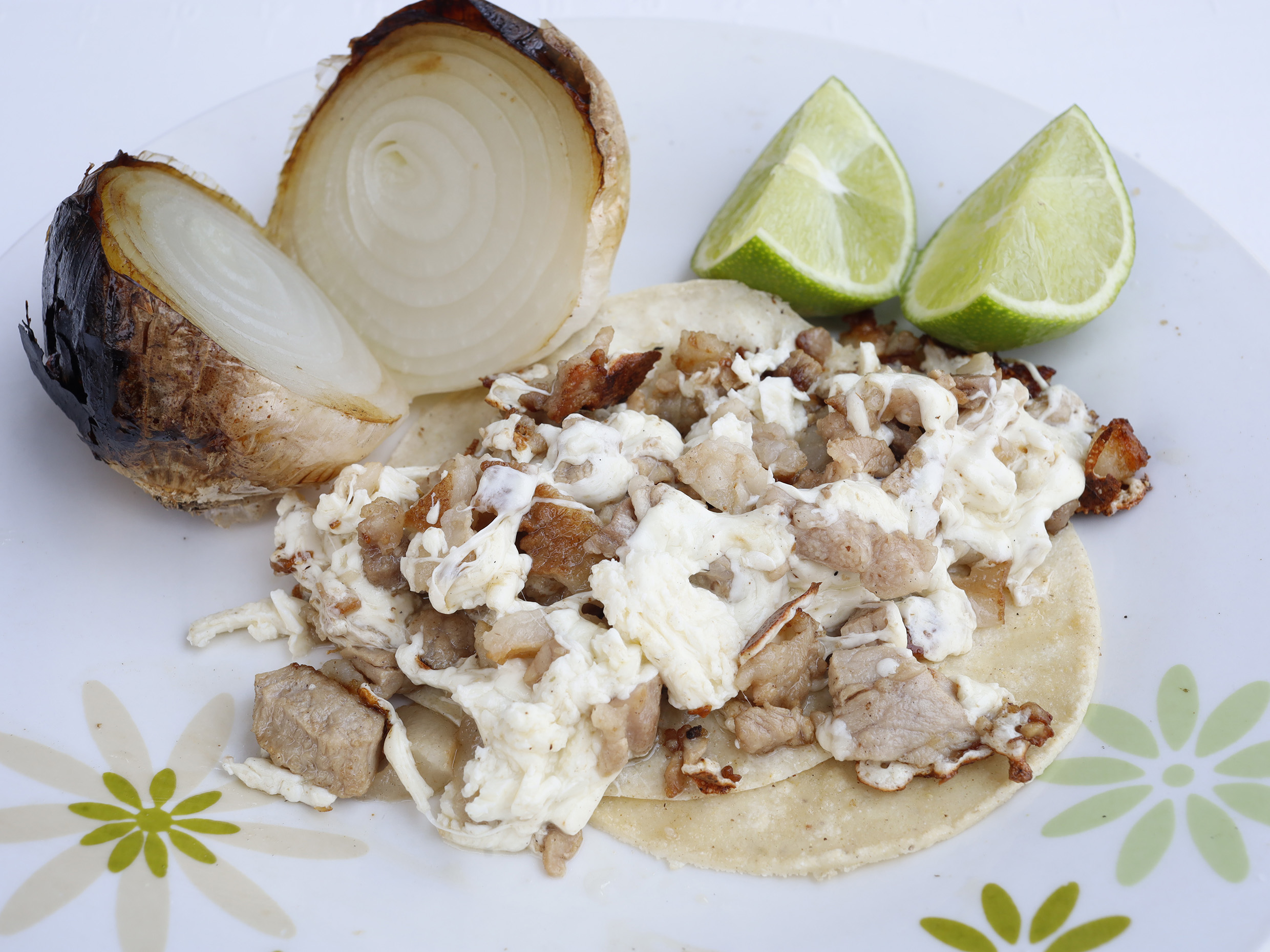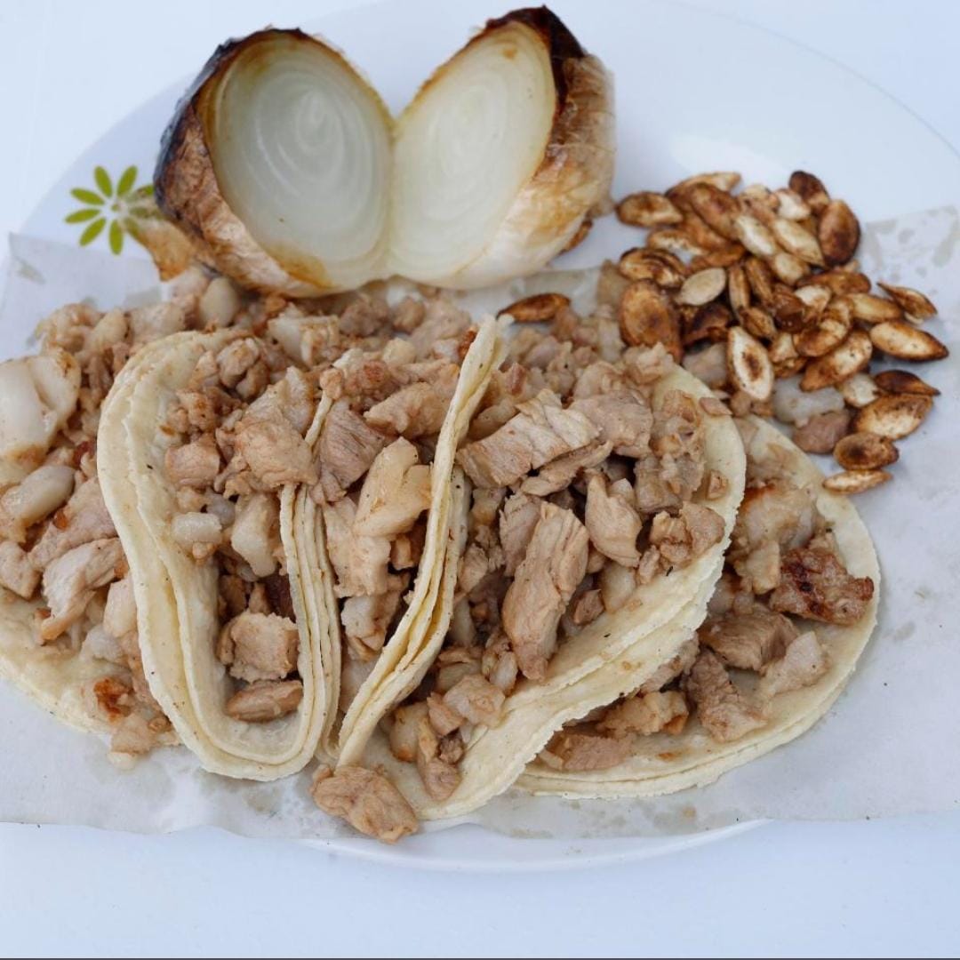 Tortilla doble de maíz, suave y calentita, con carne de puerco al carbón doradita y jugosa. Acompañado de cebolla picada y salsa casera servidas aparte, para que lo disfrutes a tu gusto.(1 pieza)