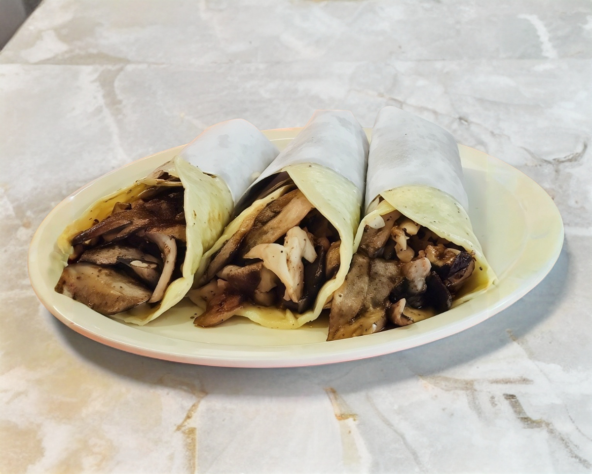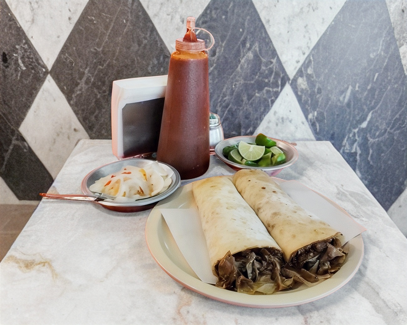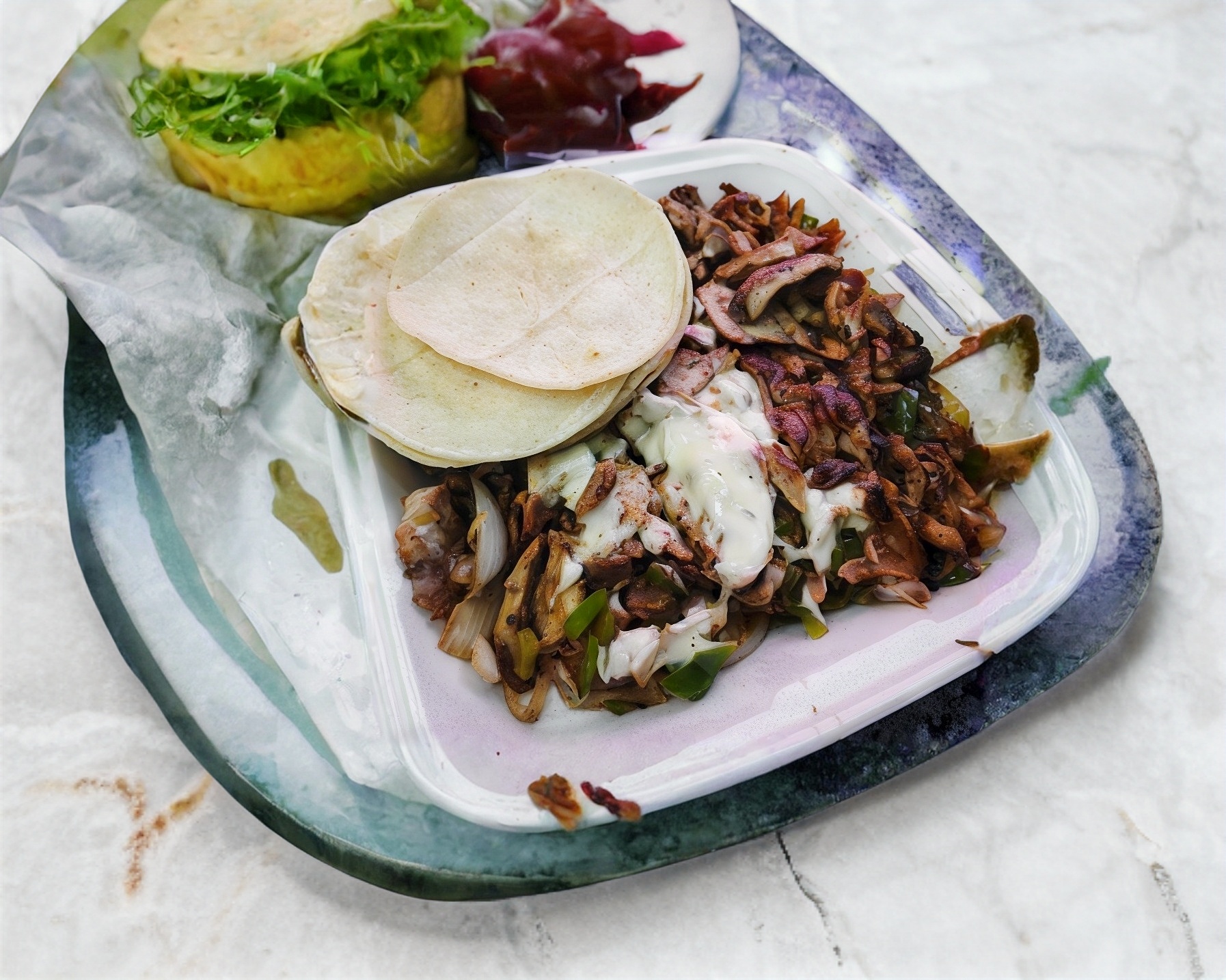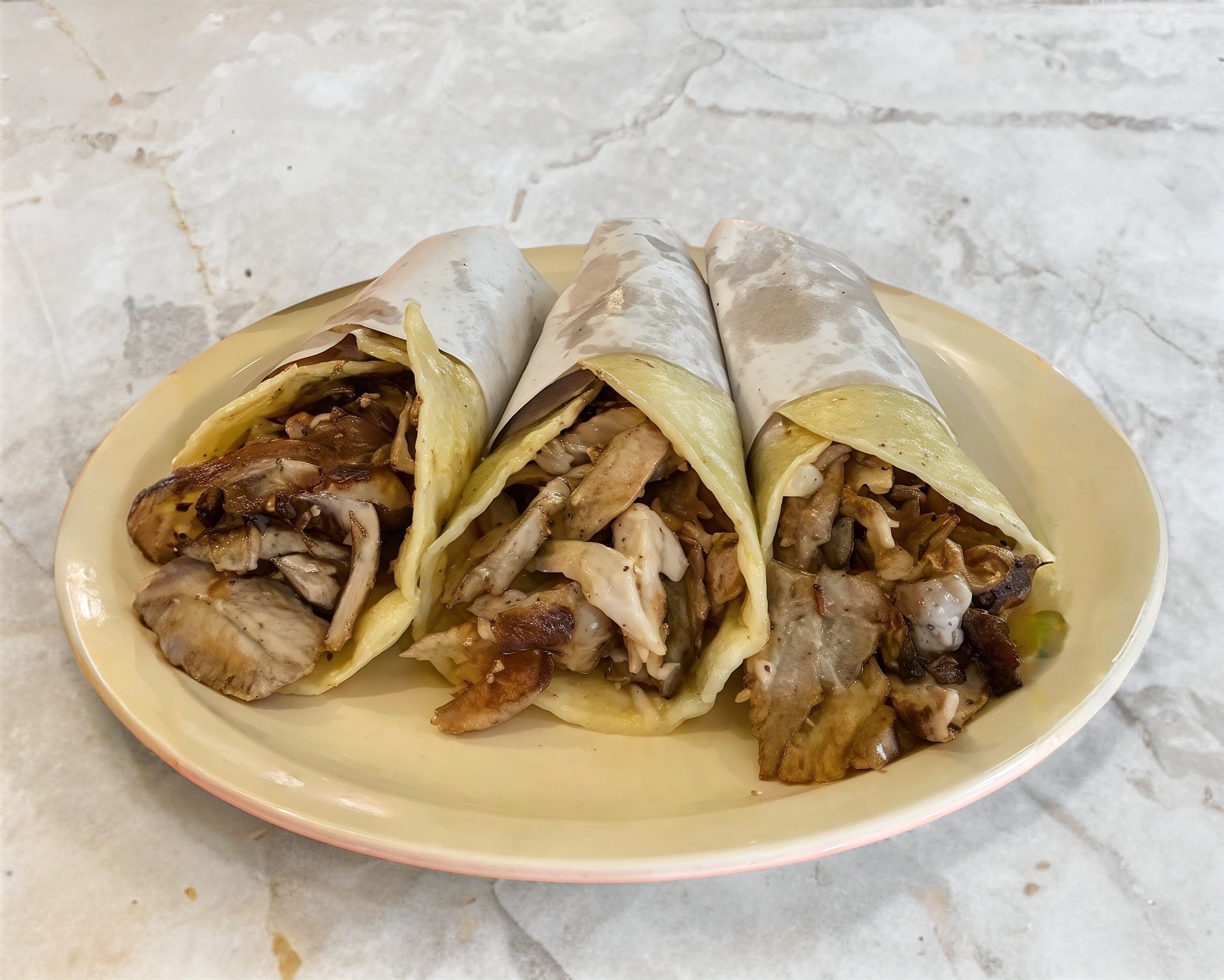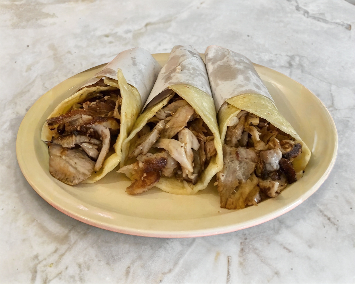 Tortilla de harina acompañada de carne árabe y pastor - queso manchego - cebolla - cilantro